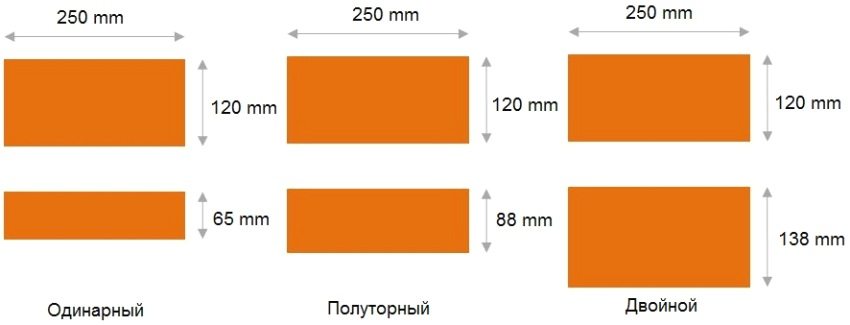 The red brick size standard has the following dimensions: 250x120x65 mm. The name "one and a half" or "double" speaks for itself. This means that you need to multiply the size of an ordinary red brick by the appropriate factor: 1.4 or 2.1. That is, the size of a red one-and-a-half brick is 250x120x88 mm, and a double brick is 250x120x138 mm. This is data from long-established norms. However, each manufacturer can make small changes to the existing parameters. Therefore, before buying, you should clarify all the dimensions of the purchased product.