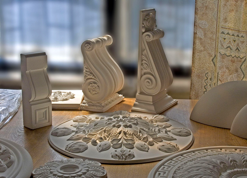 To create a form, you need a template or an original product. What is noteworthy is that all technologies for working with plaster can be interconnected to create any of the decorative elements. For example, models of decorative rosettes and other types of stucco molding can be made by sculpting.