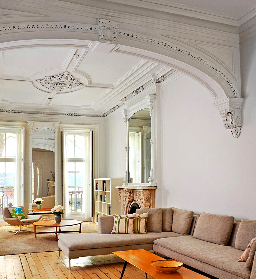 Plaster molding is always in fashion, and its use in decoration will make the interior unique and inimitable. Even in small quantities, if it is skillfully made and correctly applied, such a decor will become an exquisite addition and favorably emphasize the dignity of the room. In addition, stucco molding will help to visually correct the space and hide various irregularities on the surface of the ceiling and walls.