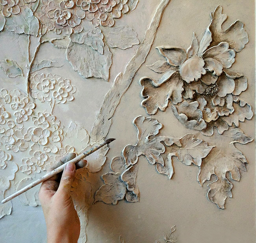 When creating a bas-relief with plant elements of a branch, depending on the thickness, it is most convenient to remove it with a confectionery or medical syringe. The thickness, in turn, is controlled by the pressure applied to the syringe plunger. The texture is applied with a brush, and the fractures are formed using a palette knife. Also, branches can be made from twine soaked in a thick working solution and then dried on a working surface. The finished products are then attached to the support wall.