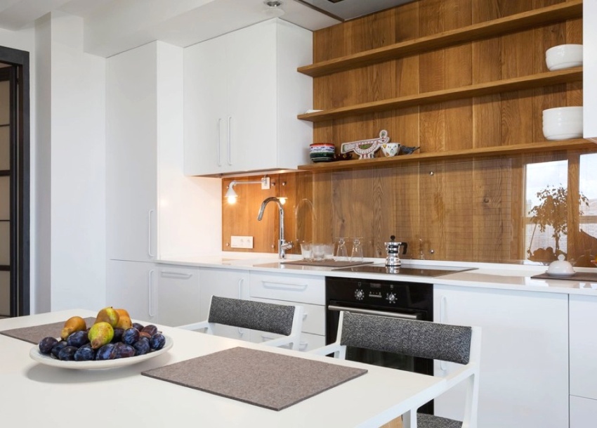 The MDF plate is very popular for arranging the kitchen. Its technical characteristics significantly surpass any other materials in this group, and therefore allow it to contact with water almost fearlessly. Among the most common options, you can find MDF kitchen countertops, as well as kitchen aprons.