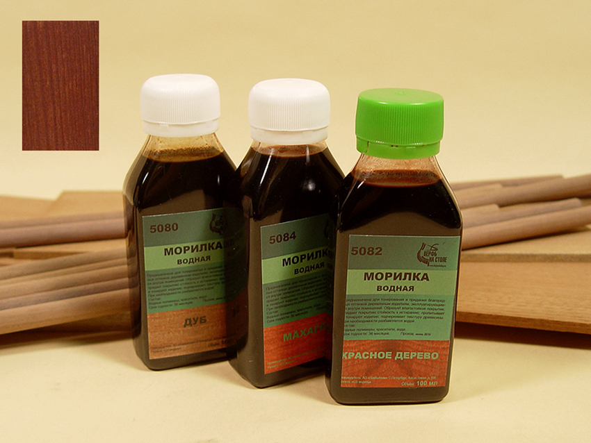 These compounds are ideal for indoor wood treatment. When buying a water stain, it must be borne in mind that this type of impregnation is not able to radically change the color of the processed material. The solution dyes the wood one tone darker and makes its color more saturated. The composition is applied in several layers.