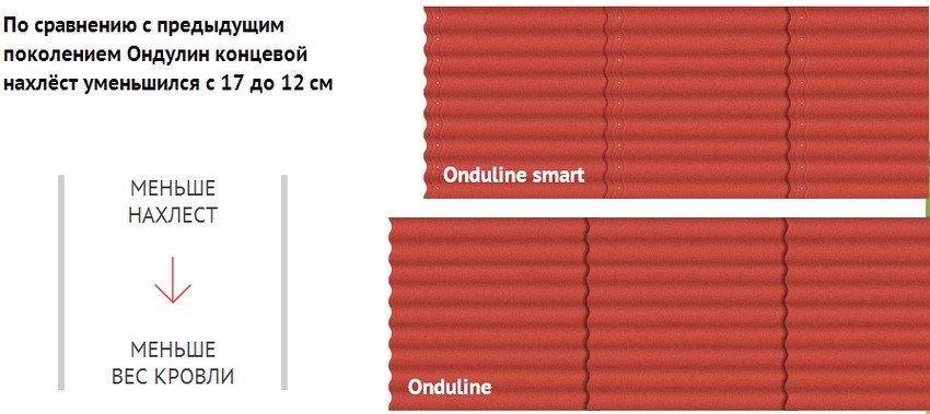 The total leaf area of Ondulina Smart is less important than traditional sheets. Parameters 1.95 x 0.95 m - new dimensions of the ondulin sheet. At the same time, the useful area is not reduced due to the technology of laying these sheets, which involves mounting them with an overlap of 5 cm less than when installing a classic ondulin. Reducing this value also affects the mass of the roof. Knowing how much a sheet of ondulin Smart weighs, you can calculate how much the total weight of the coating will decrease.