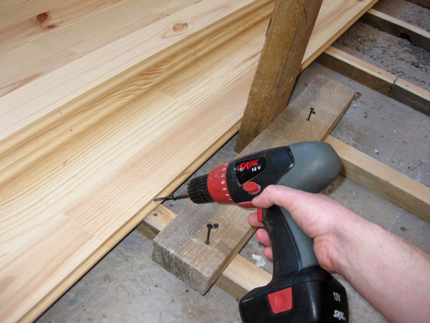 Installation of the first element should be done near the far wall. In this case, the floorboard, the tongue of which will be inside (near the wall), will easily connect to the next one. To fasten the first element, self-tapping screws are also used, which are directed at an angle of 45 degrees. Thanks to a curly screwdriver, the self-tapping screw can be deepened into the wood.