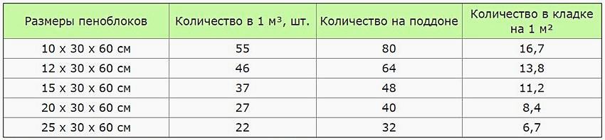 Table of sizes and consumption of foam blocks. The number of blocks in the masonry per 1 m2 provided that the horizontal support area of the blocks is 30 cm in width (wall thickness) and 60 cm in length