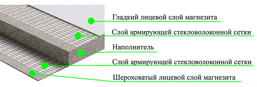 Synthetic fibers are added to the composition as additional binders, and perlite significantly increases the sound insulation characteristics. The main properties of glass-magnesium sheets: strength, hardness, fire resistance and moisture resistance. The material is resistant to fungi, mold, and is able to keep its shape for a long time under the influence of a humid environment.