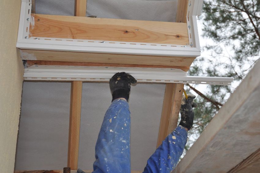 - a supporting profile is installed on the timber. It has a j-groove. The soffits will be installed in it. The panels have the same groove. This provides the required rigidity of the future structure;