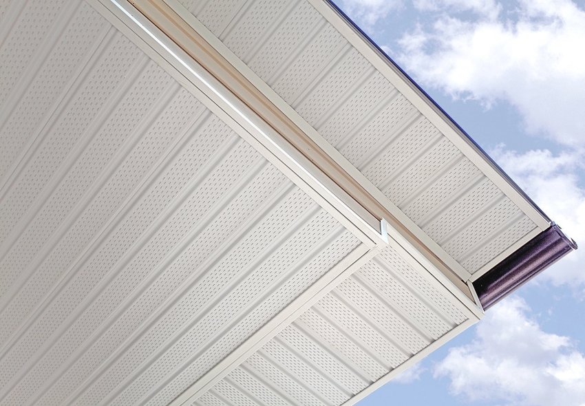 - fully perforated. It is recommended to choose this type for finishing overhangs with cornices, visors, skates. Perforated soffit is the best choice for gazebo roof, porch or veranda. It will provide the necessary ventilation.