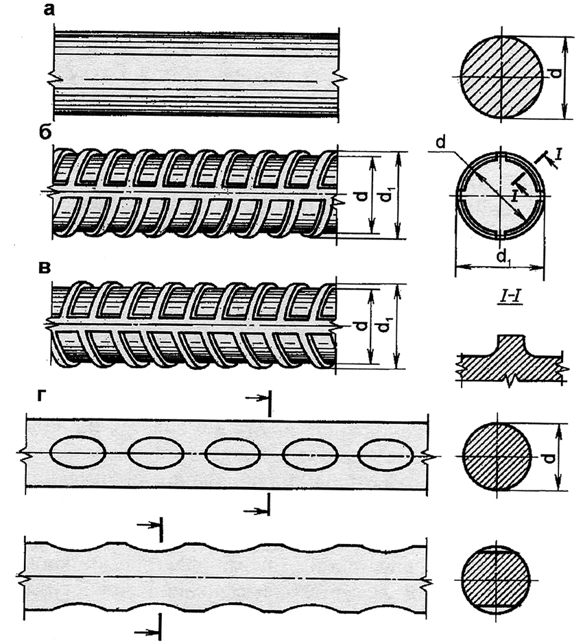 a - rod smooth, class A240; b - rod periodic profile of class A300; c - class A400 and higher; g - wire class B600