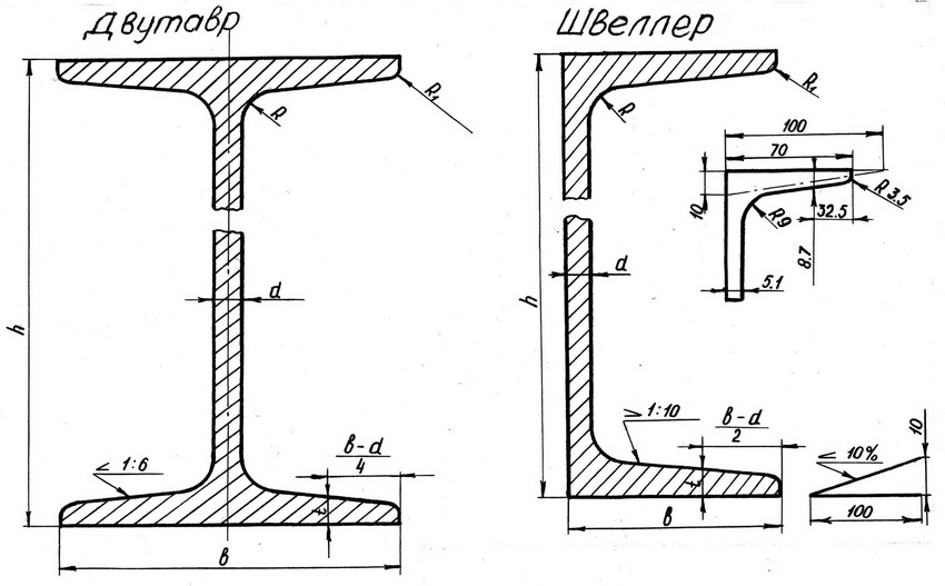 The production of rolled H-shaped beams is carried out in accordance with a special GOST. Gosstandart distinguishes between individual types of beams. The main classification is the division of products into hot-rolled and special products. The first type is I-beams with inclined flange edges. They are regulated by GOST 8239, which provides for an angle of inclination with limiting values of 6-12%.