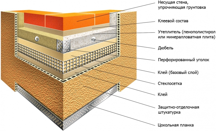 The technology of plastering external walls involves the creation wet facade, which consists of insulation, reinforcing mesh and textured plaster.