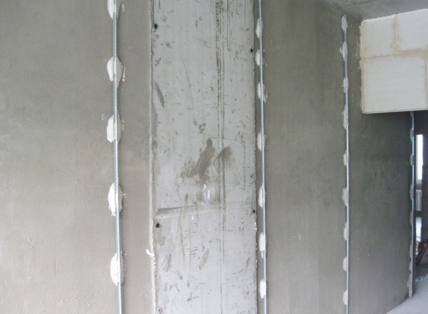 After the wall is dry, you should start installing beacons for wall plastering. Here you need to be extremely careful. The appearance of the finished surface will depend on this. The metal beacon must be attached vertically to the wall to the previously marked place. Next, the topmost screw is screwed in. A plumb line is attached to it, which will control the location of subsequent screws and, accordingly, the placement of the profile. The main task is to align the profile. It will pull away from the surface in places where there are depressions, and fit snugly on the bumps.