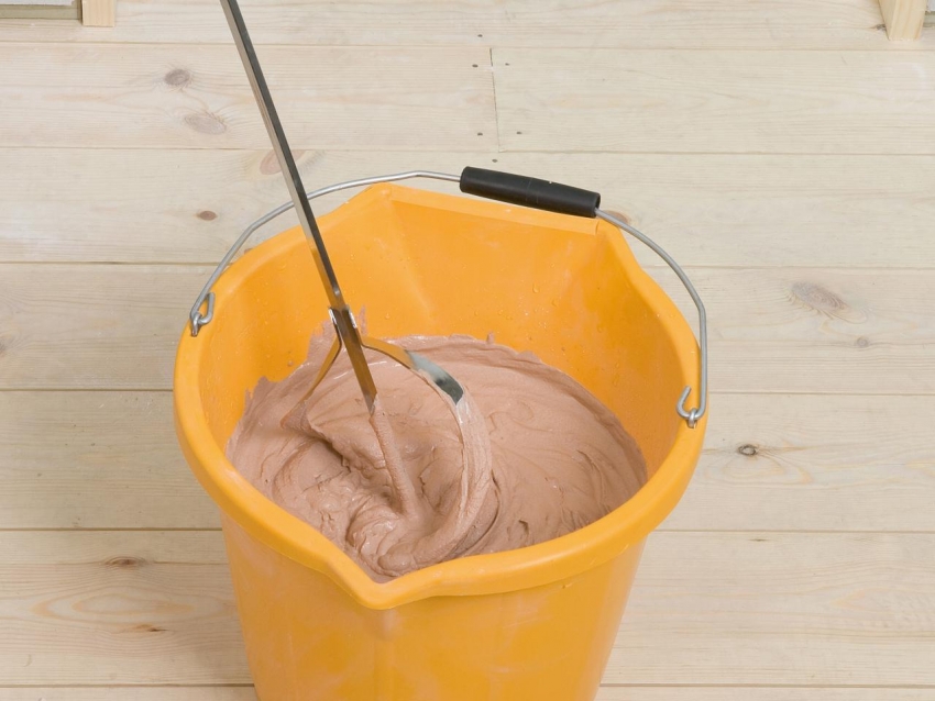 A measured amount of dry powder should be added to the water. Mixing of ingredients can be done manually with a trowel. But it is faster and more convenient to prepare the mixture using a construction mixer, which should be turned on at medium speed. Stirring should be carried out until the mass becomes homogeneous without residues of dry matter, lumps and excess moisture on the surface of the solution. The consistency of the working solution should be similar to thick sour cream.