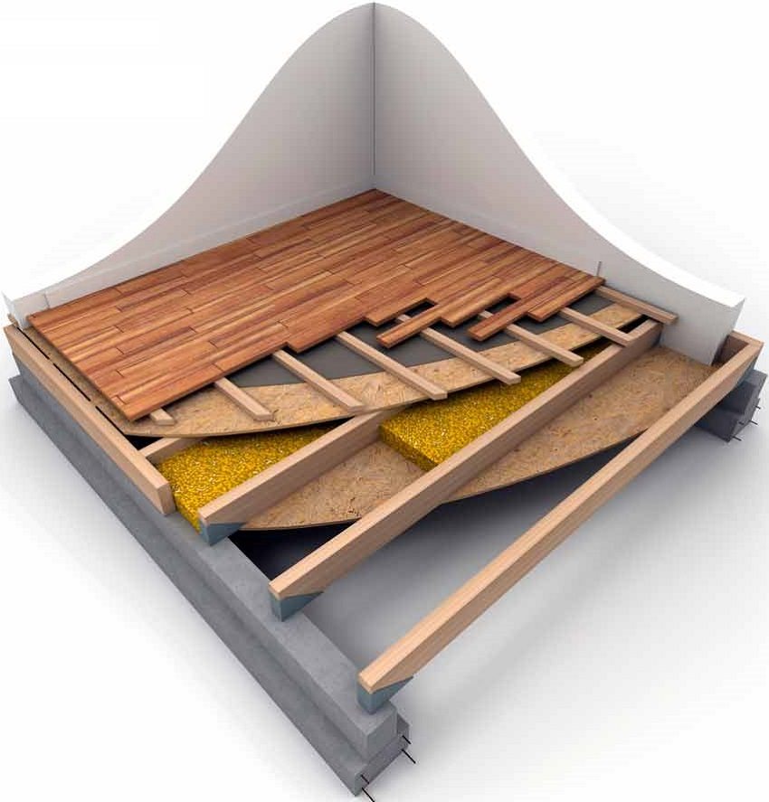 In addition, mineral wool cakes over time, and thermal insulation decreases. Therefore, when insulating a wooden floor from below in a private house using mineral wool, several overlap layers should be mounted.