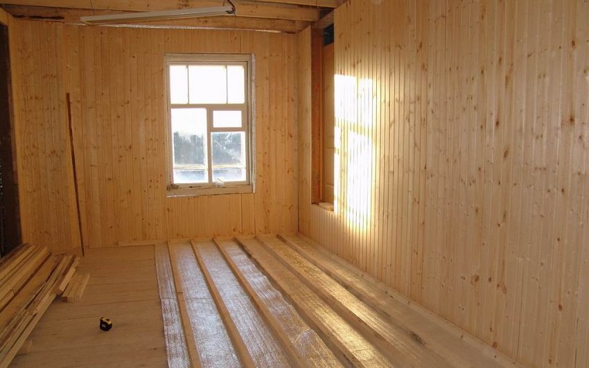 - Penofol is again laid between the lags, and all seams and cracks are filled with polyurethane foam.