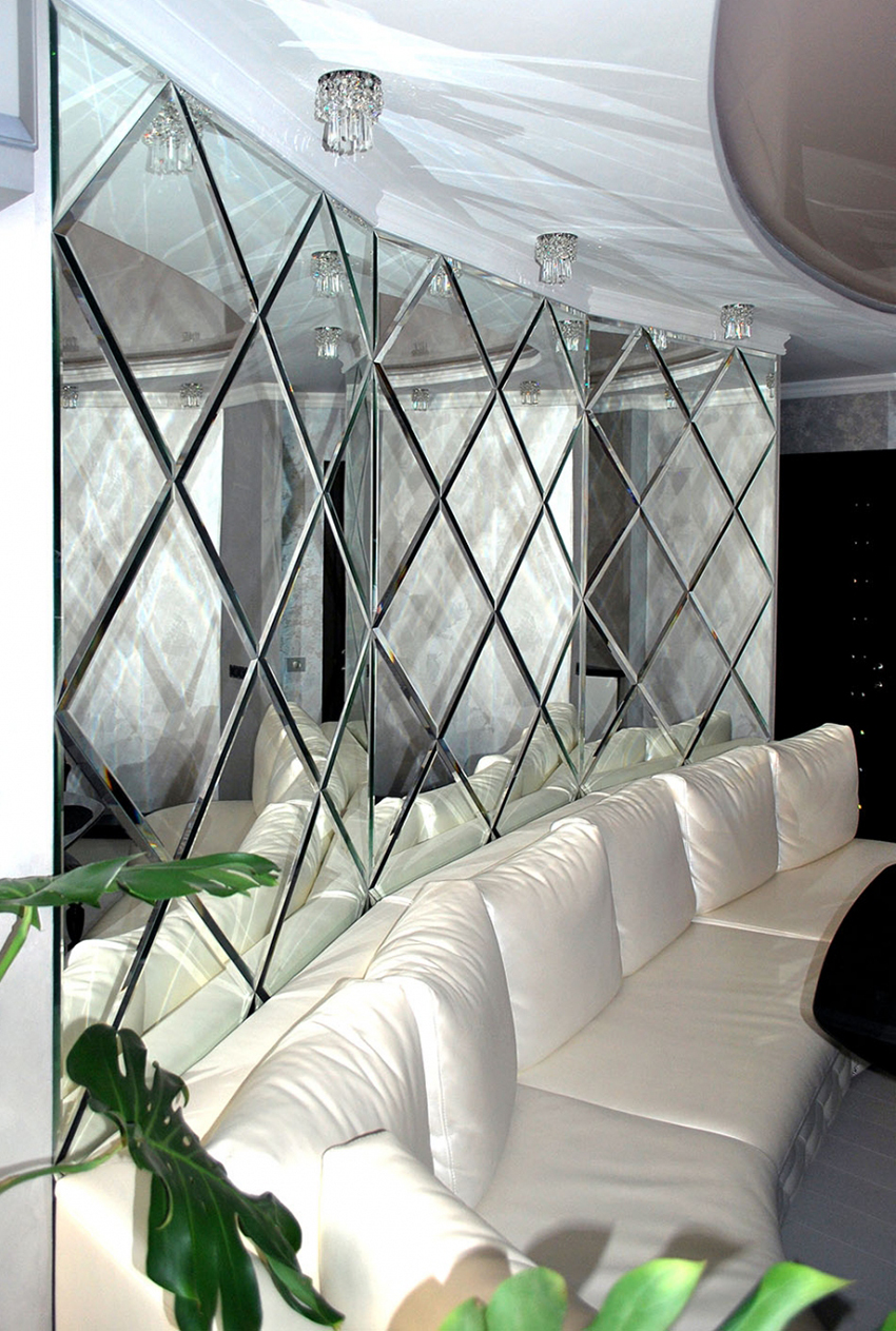 Mirror tiles have proven themselves well in the interior of the living room. With its help, you can zone the room. This is a good solution in combination with a multilevel ceiling. You can also lay out one of the walls of the room with facet tiles, which will visually expand its dimensions and emphasize the interior details. Here you can use tiles with engraving, painting or patterns on the surface of the products.