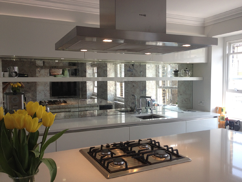 Mirror tiles in the kitchen can be found when decorating an apron - the surface between the countertop and the cabinets of the upper tier. However, such a panel will quickly become dirty from splashing water and oily deposits. Such a surface needs regular cleaning. The mirror surface also looks good in the dining area.