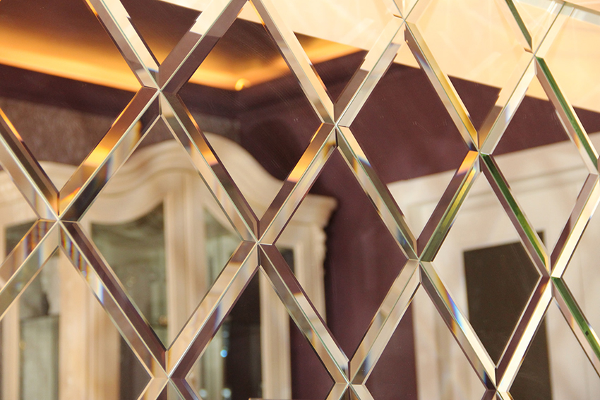 The beveled tile is represented by a small fragment of a mirror having a strictly specified shape and size, the edges of which are processed in a special way: the bevel is removed from the beveled side of the product. Such processing gives the mirror coating a more refined, graceful and unusual look, allowing to reveal new facets of the use of mirror panels.