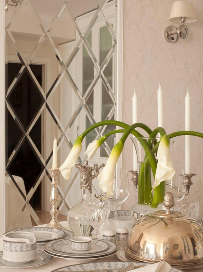 Another good design solution is to use the property of the mirror to double objects located next to it. Near the mirrored wall, you can put several flowerpots with indoor flowers or beautiful glassware, the amount of which will double in the mirror image, which is clearly demonstrated by photos of mirror tiles in the living room interior.