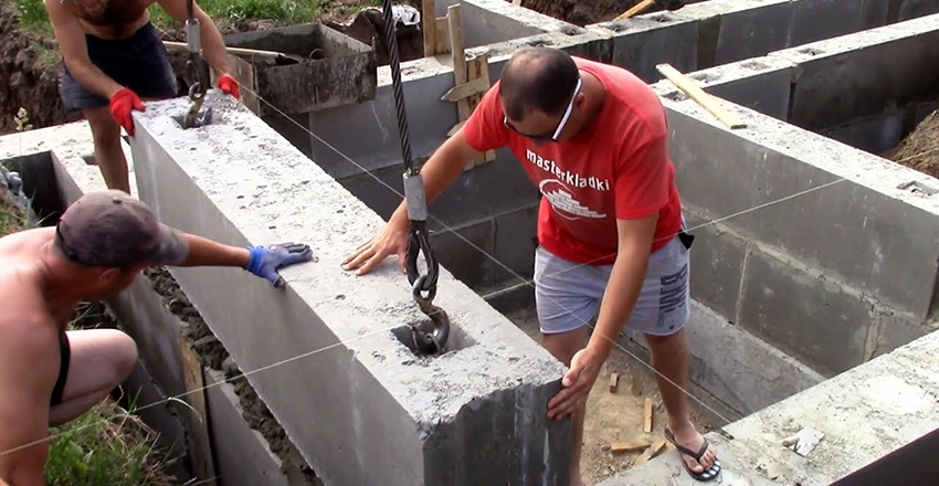 Since the concrete blocks for the basement walls are of sufficient weight, they are laid with the use of a crane. Corner elements are laid on the waterproofing. Concrete blocks are laid according to the principle of erecting a brick wall. A 2 cm thick masonry mortar is used to connect the elements. Each row should be checked for horizontalness.