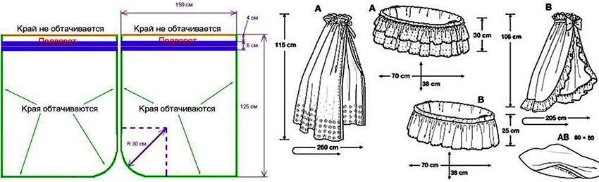 There are other canopy options. Some items are made from a solid piece of fabric. Sometimes curtains are made of several elements in the form of wide ribbons. In this case, they flow beautifully around the crib. Regardless of the design chosen, most awnings are made in the same way. The patterns of canopies for a crib mainly differ only in size.