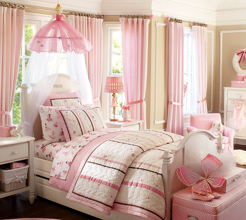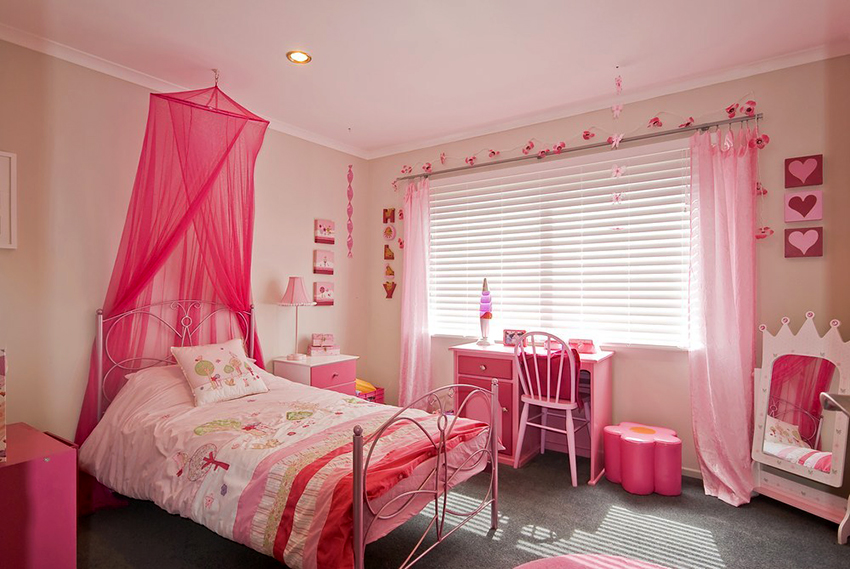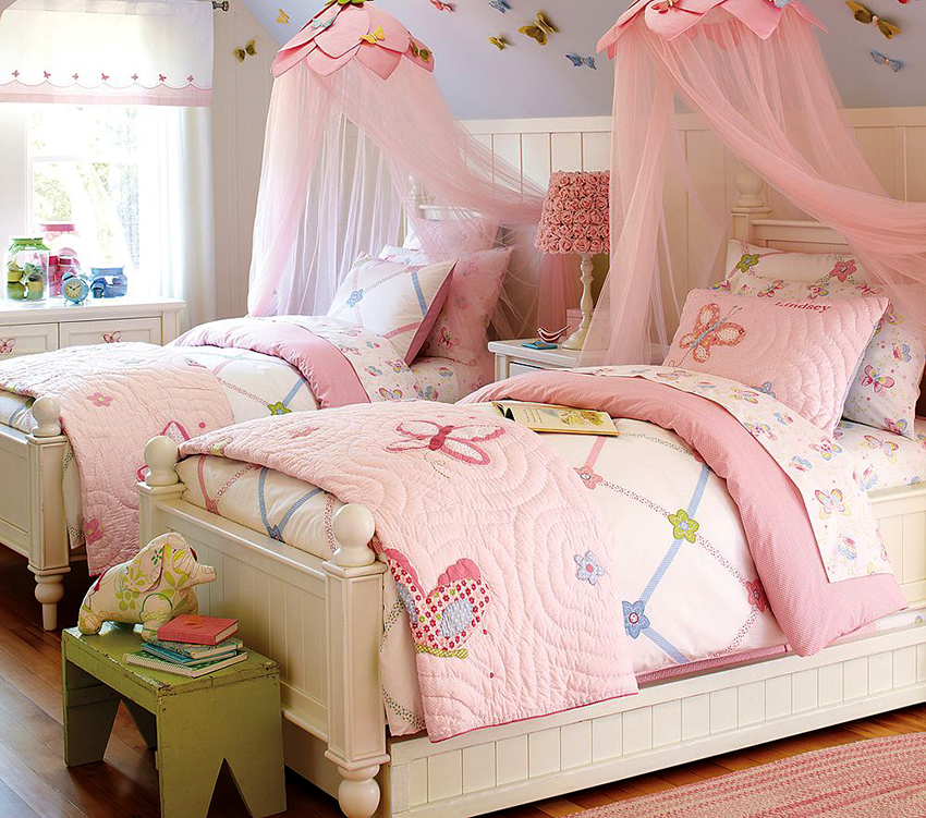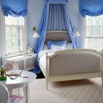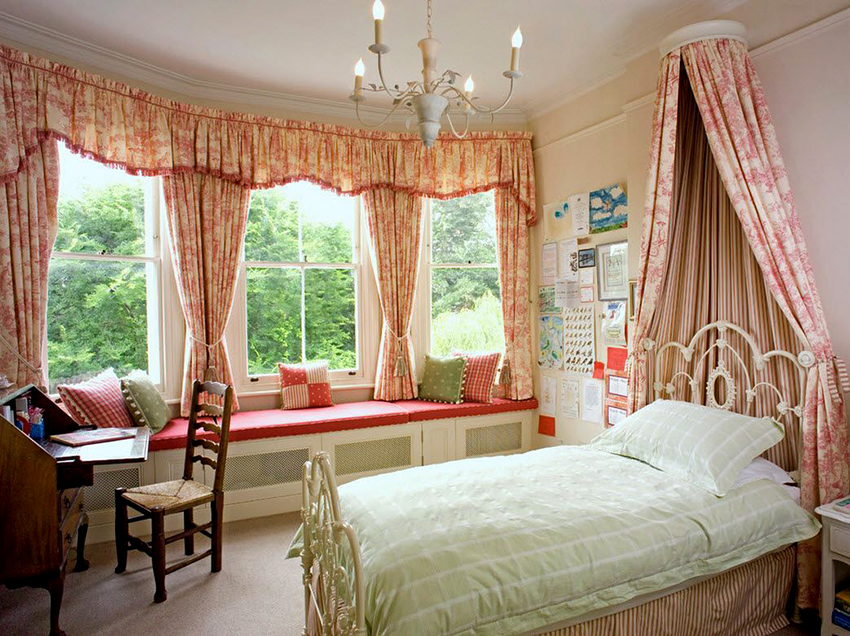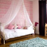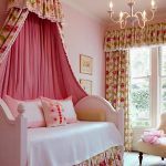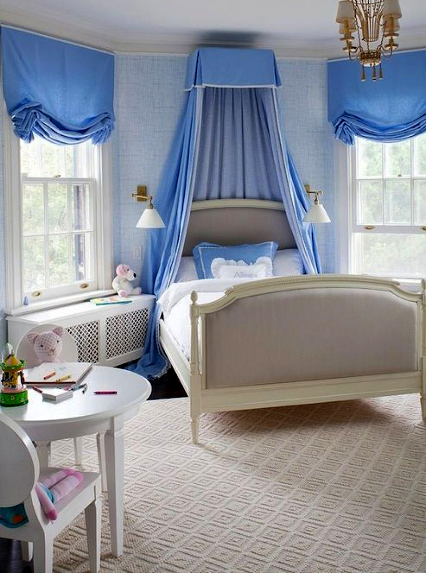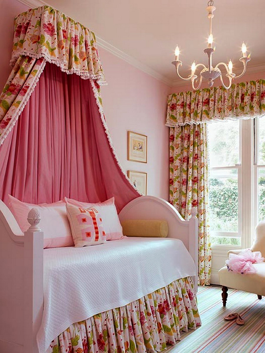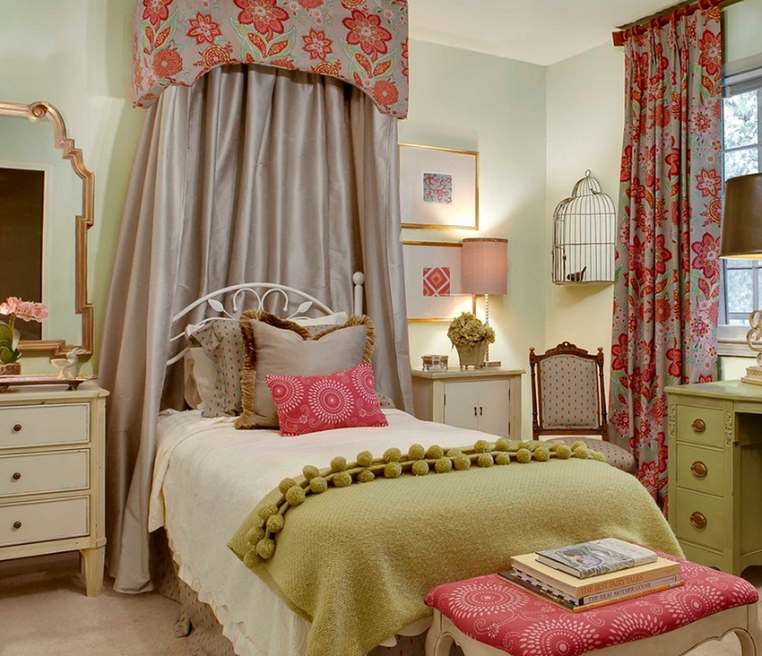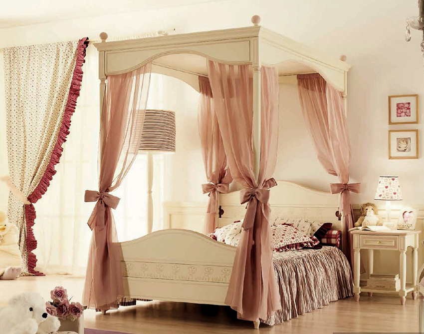 A universal version of a canopy over the bed for a girl is a canopy made of translucent white fabric. These curtains wrap the bed beautifully and form slight folds. If the room has a wall-mounted canopy, it can be decorated to match the bedspread on the bed or the color of the curtains.