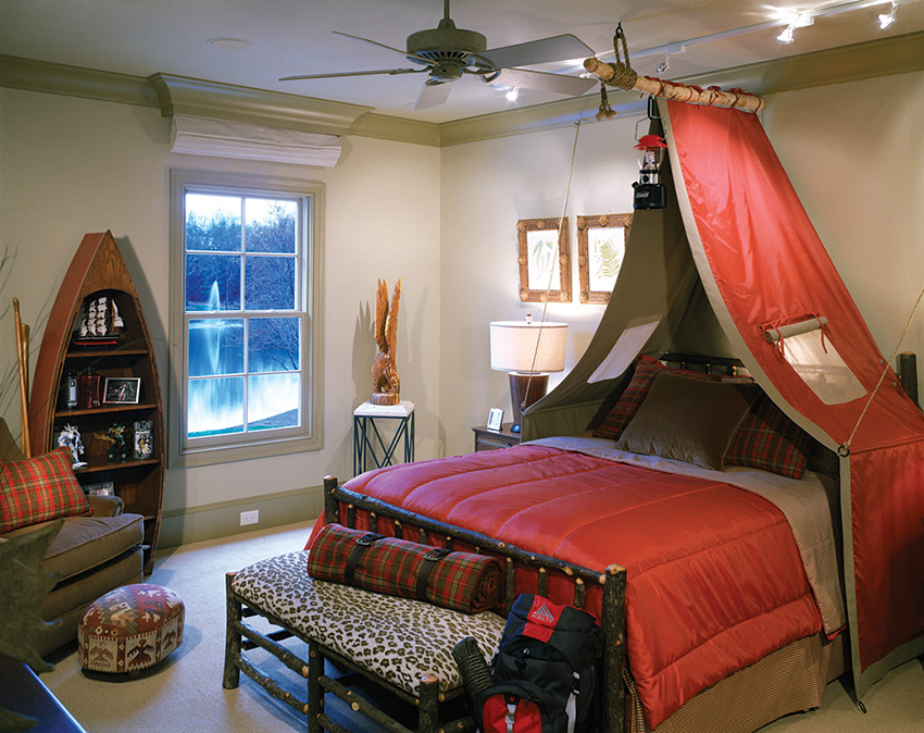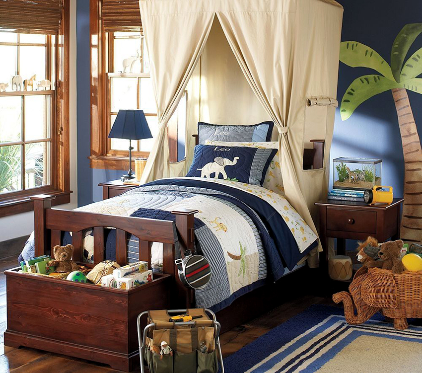 Brown, blue and green shades are suitable for canopies in the boy's room.