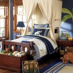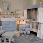 So that the design of the nursery for the boy does not look girlish, you can install a canopy in the shape of a ship's sail. A good option would be curtains made of camouflage mesh.