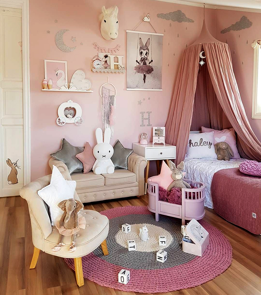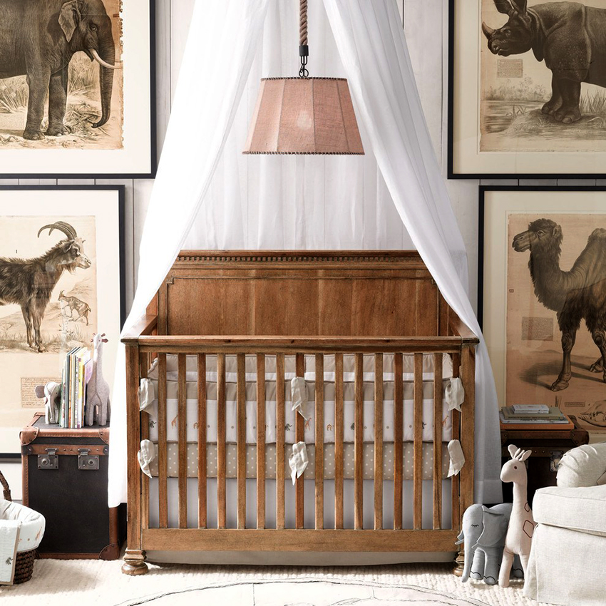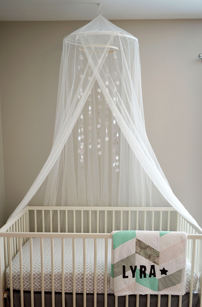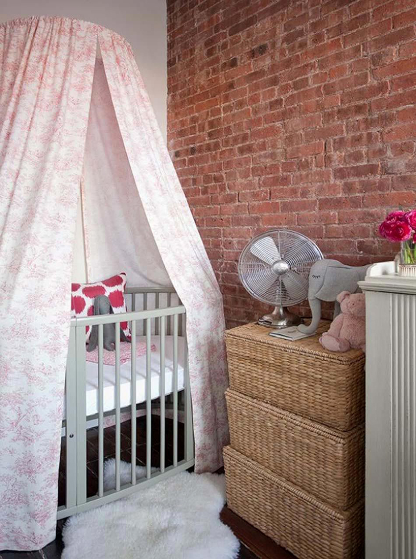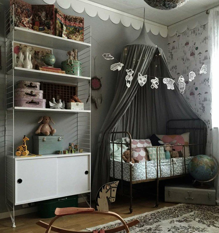 The canopy in the nursery can be styled to match the concept of the room
