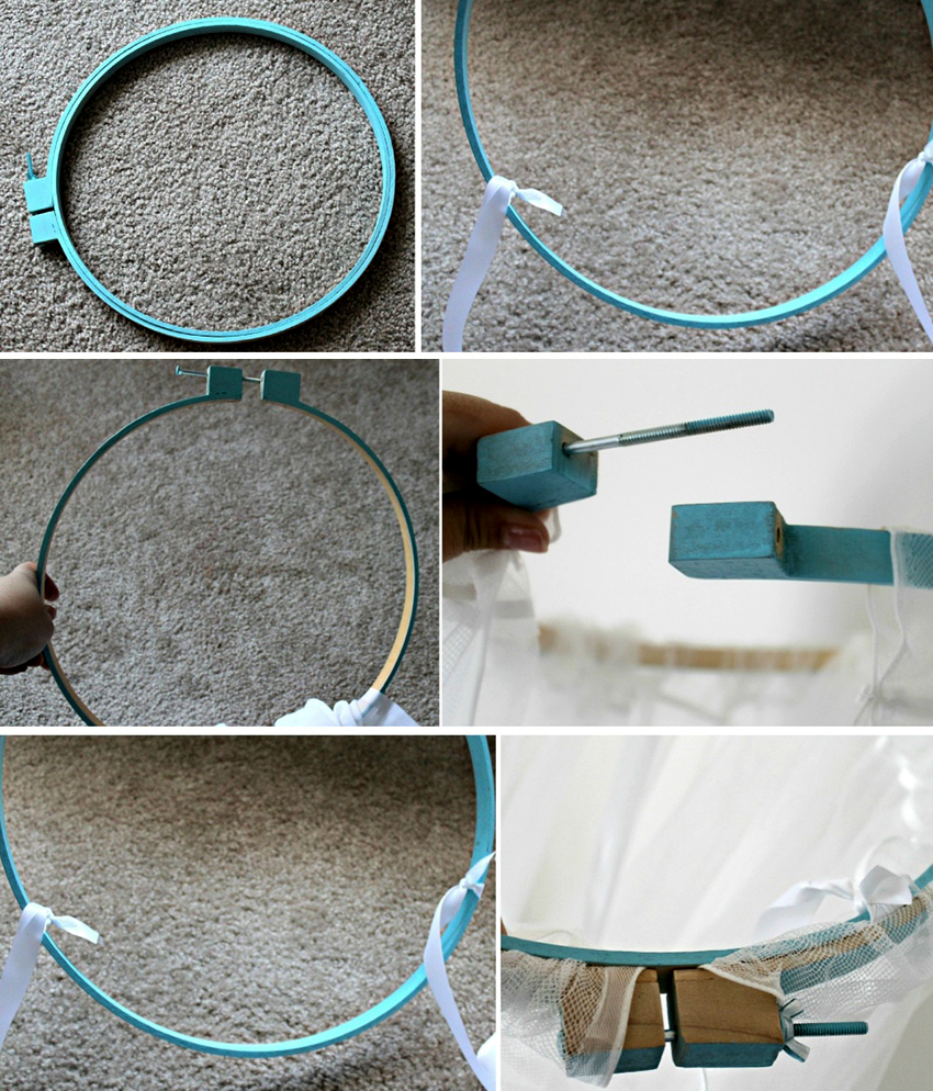 The fastener can be made independently on the basis of a very thick wire. It curls in the shape of the letter "P" or a circle. Then a hollow tube is fixed to the side of the crib, where the wire is inserted along with the canopy put on. All parts of the homemade mount must be securely fixed. You can also use other attachments to install the canopy, such as a large hoop that hangs from the ceiling hook.
