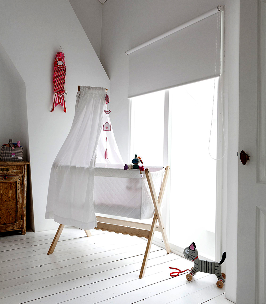 If the parents' bed is in the middle of the room, it is better to use a carrycot on wheels instead of a crib. This mobile version of the bed is easy to use. The carrycot is easy to move and can be positioned next to the mother. In this case, you should use a canopy, which is fixed to the headboard. This allows the carrycot to be installed on either side of the bed.