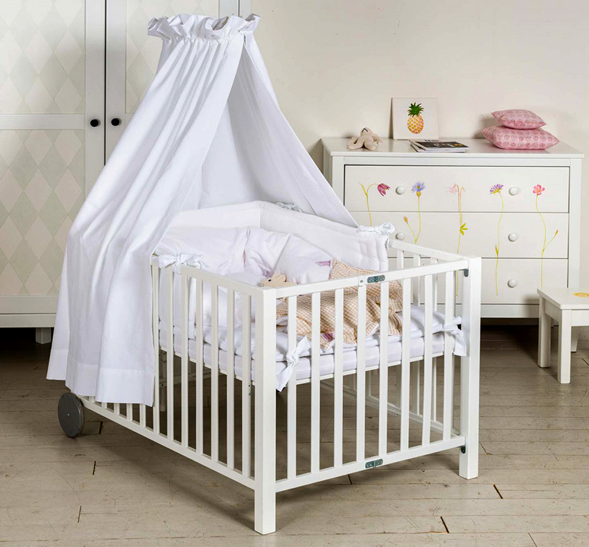 The fabric canopy helps you fall asleep quickly. If the crib is in a room with a TV or computer, lights and sounds can distract the baby. The canopy darkens the sleeping place (especially when it comes to models made of dense fabrics), thanks to which the child falls asleep peacefully.