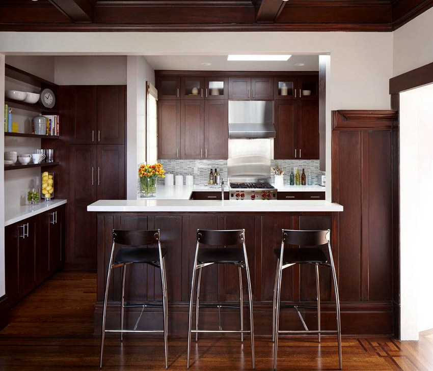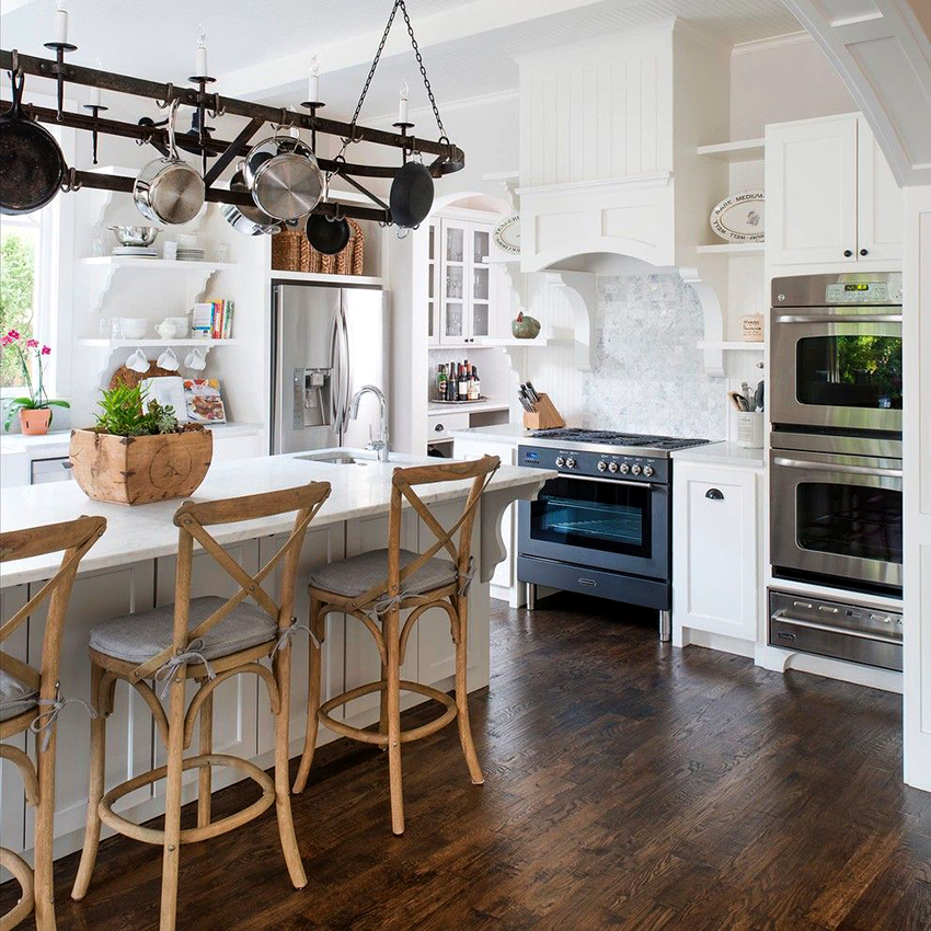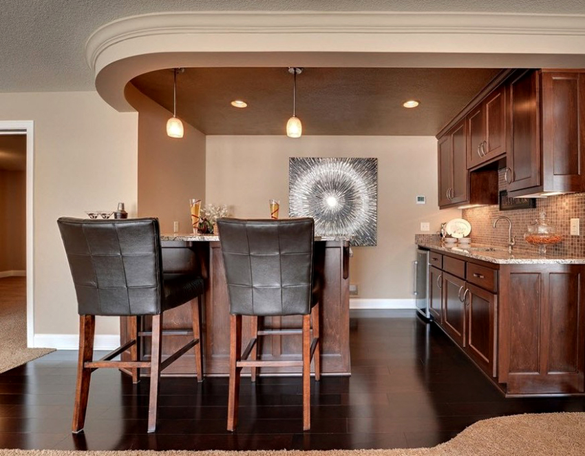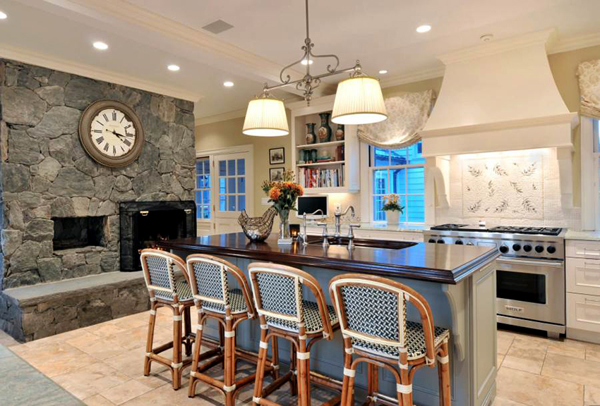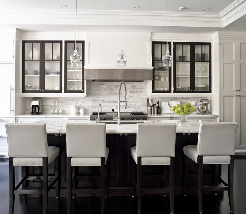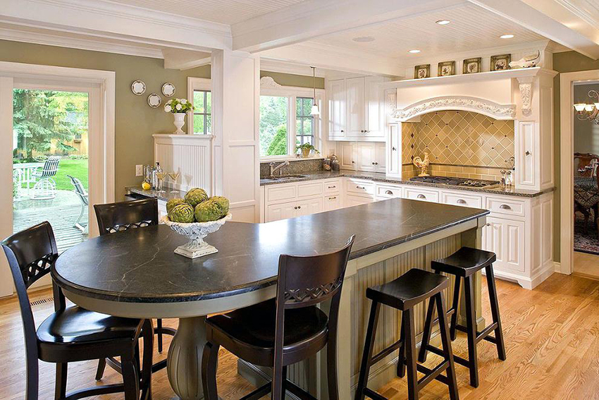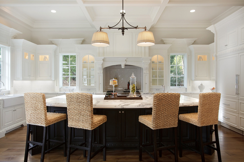 Classic cuisine is the epitome of luxury and naturalness. It is characterized by massive wooden or wrought iron bar stools with backs and armrests. The seats must be soft, with fabric or leather upholstery. Wicker stools made of wicker or wooden structures trimmed with simple fabric will fit into the Provence style.