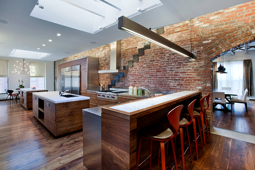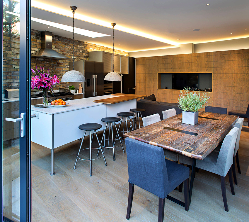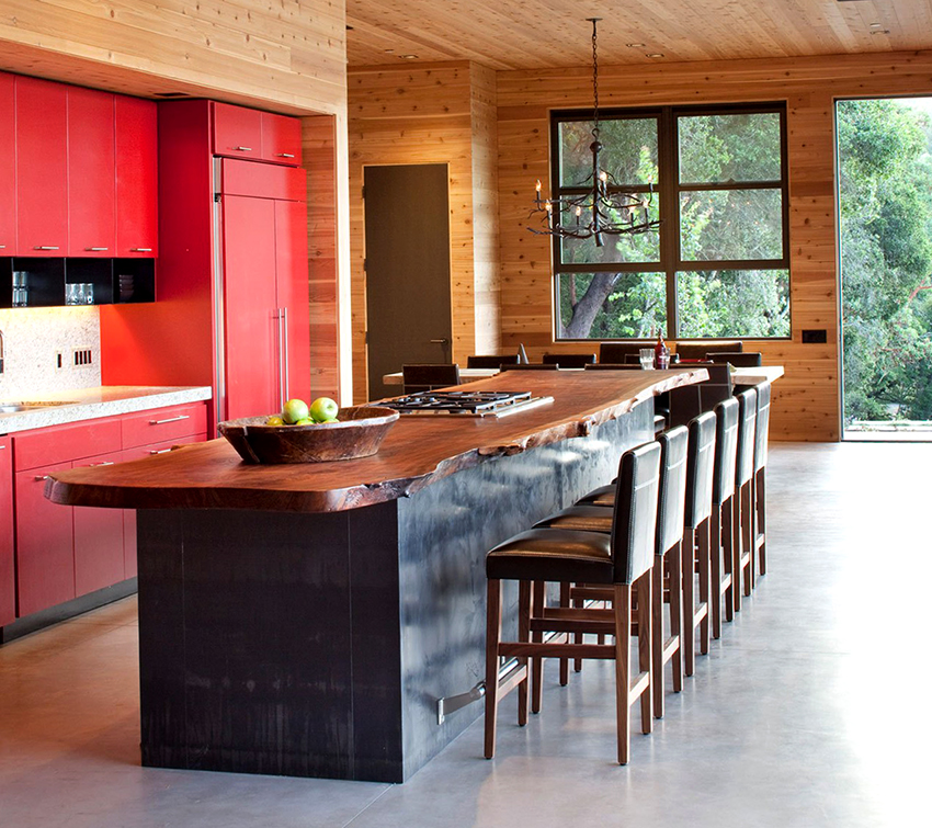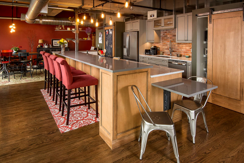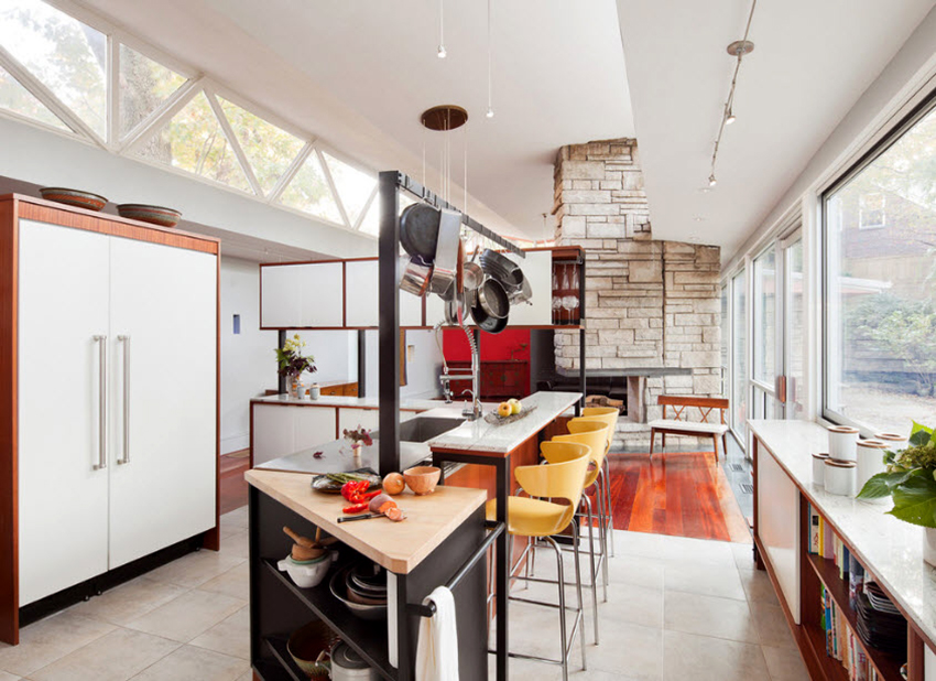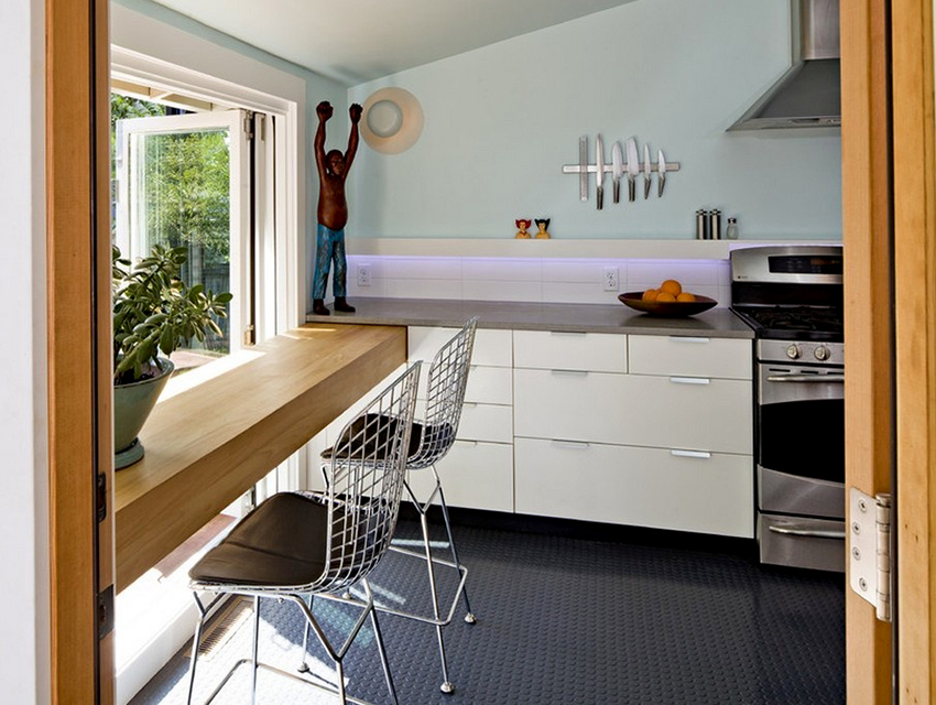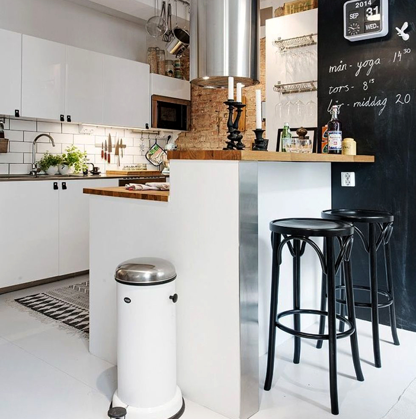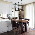 For a family whose households are very different in height, you can purchase bar stools with adjustable leg height. This design is installed not only near a high rack, but also near a standard dining table.