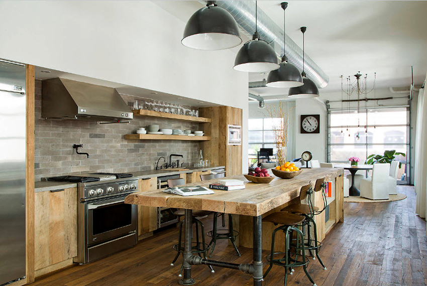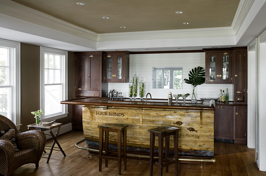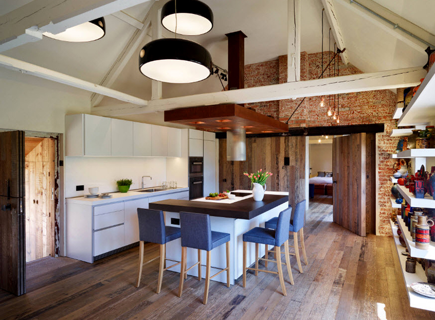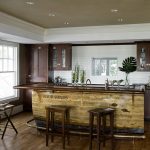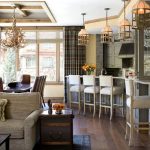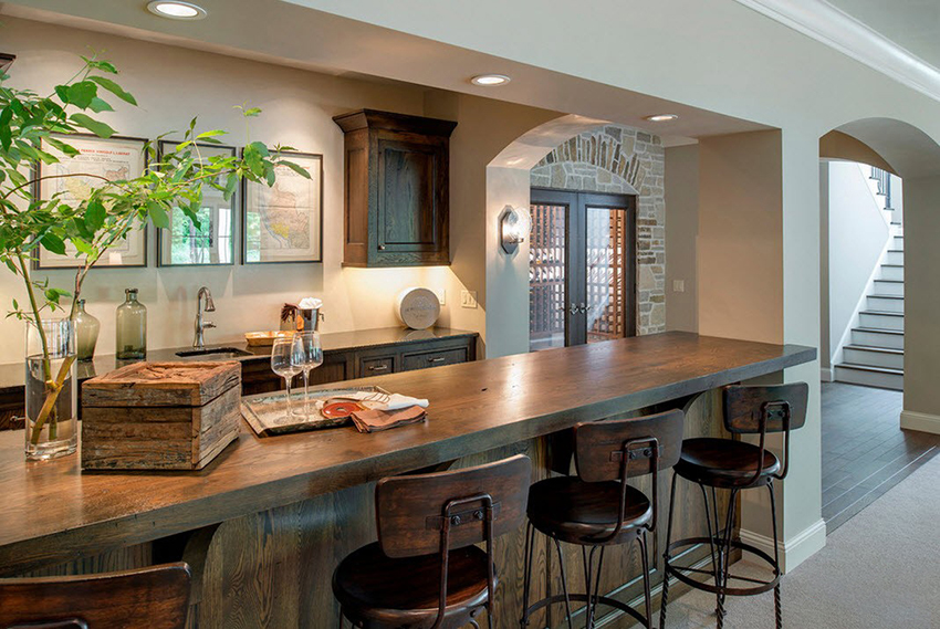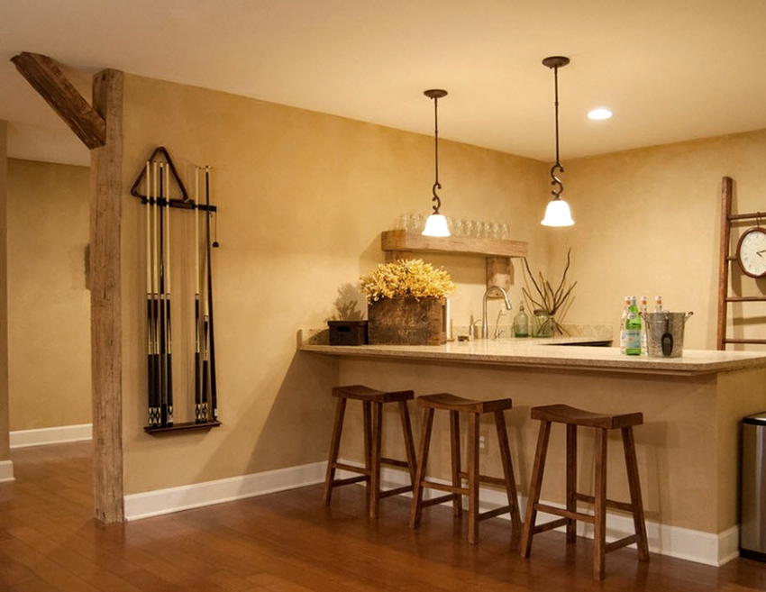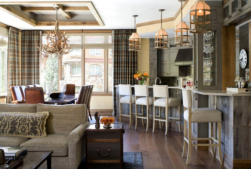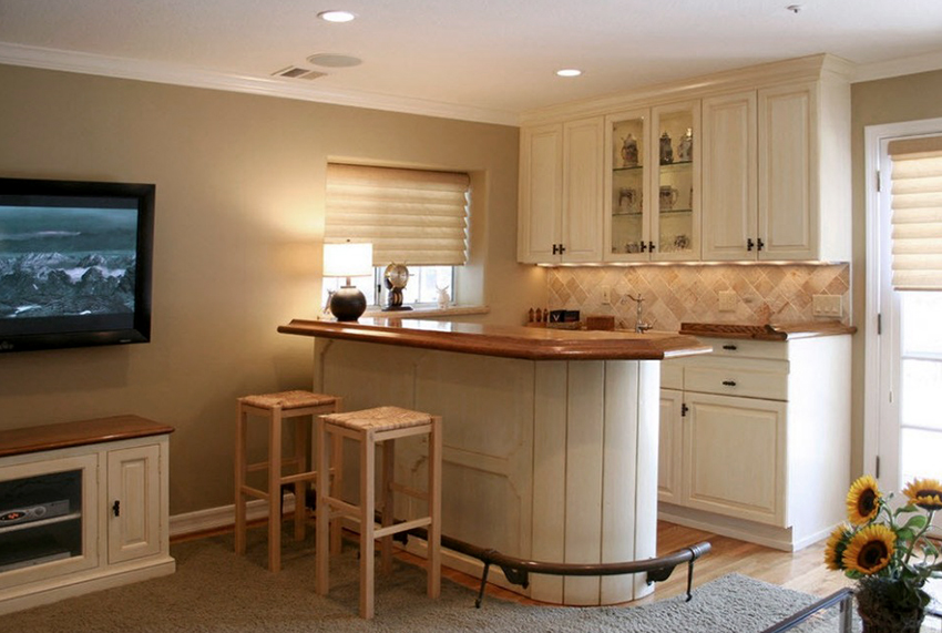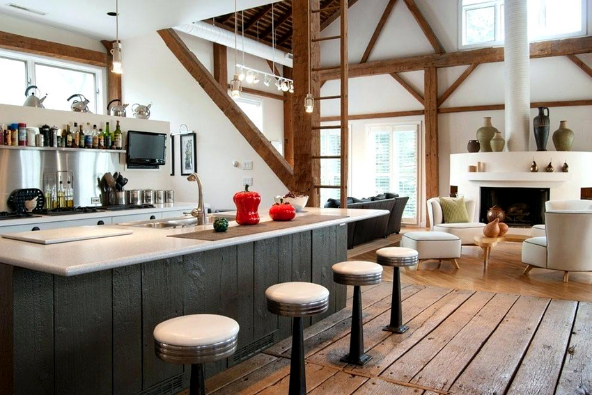 For a cozy room in the country genre, bar stools made of wood or metal, both with and without upholstery, are suitable. It is better to choose a fabric for a seat in a strip or a cage, which will emphasize the simplicity and comfort of the stylistic direction. Products with wicker seats also look original in the interior.