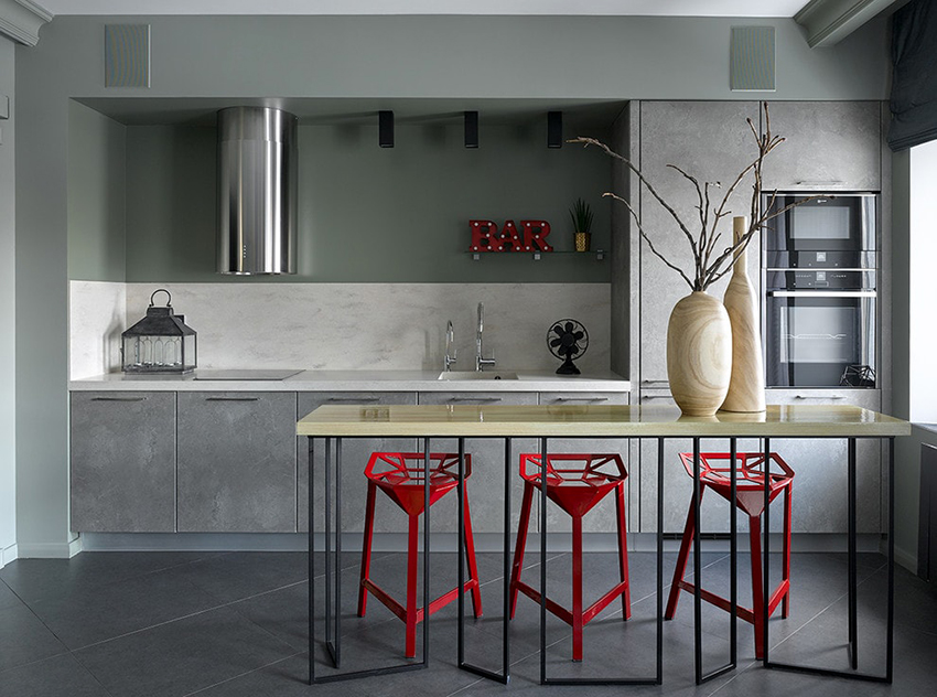 For high countertops measuring 120-135 cm, it is advisable to install chairs with a height of 90-100 cm. For standard racks (100-110 cm), constructions with a height of 75-77 cm are suitable. When choosing the dimensions of a chair, you should also start from the physique and height of the person. It would be preferable to purchase chairs equipped with a special mechanism - a gas lift, which allows you to adjust the height of the chair in the range of 56-76 cm.