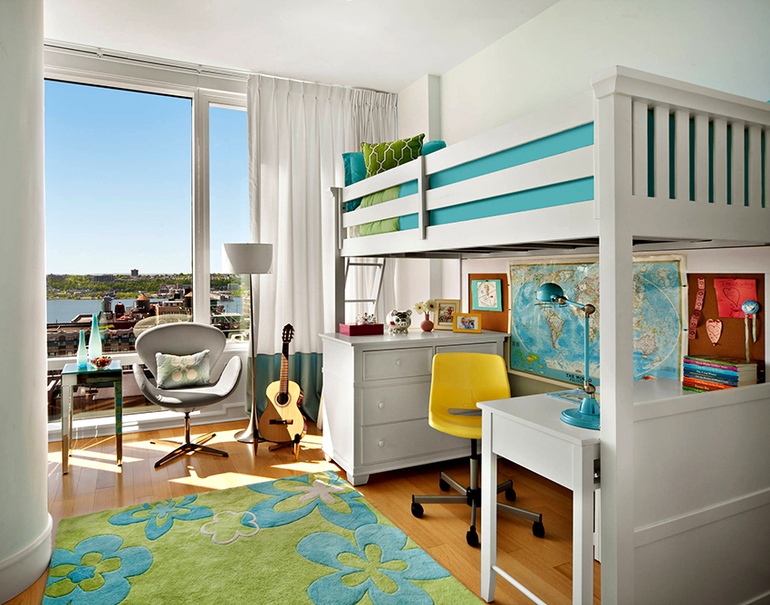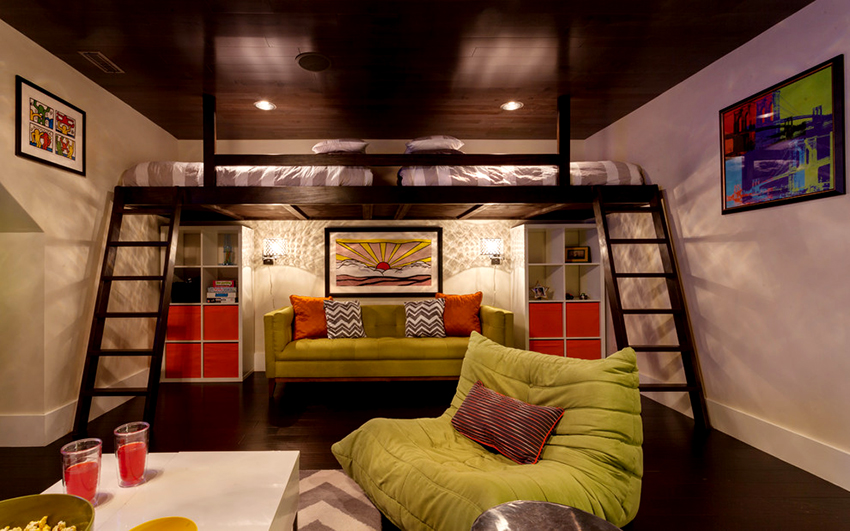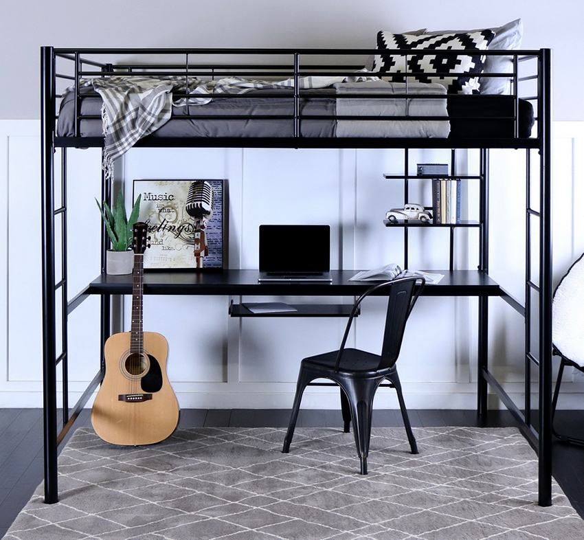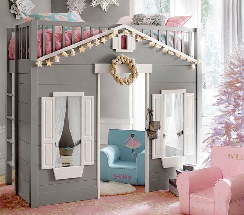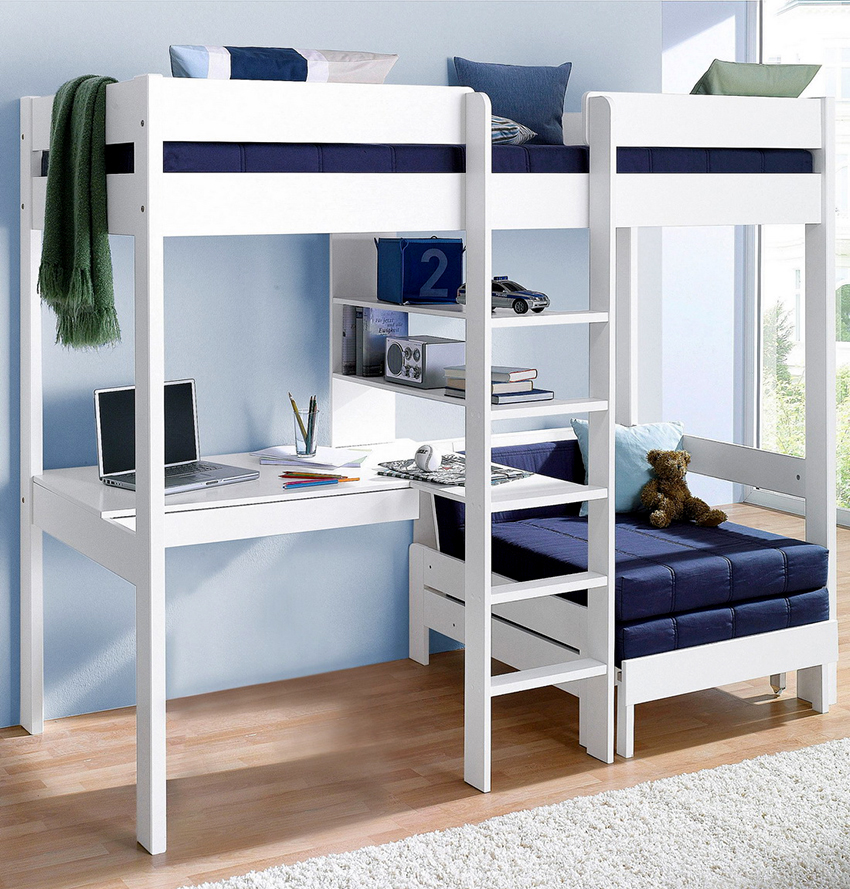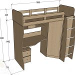 The loft bed is considered more functional. The sleeping place is located upstairs. Under it, you can organize a full-fledged storage system by placing a chest of drawers, wardrobe or shelving. The creation of such a structure requires skills and abilities in furniture production. For two children, you can make a two-tier structure, the creation of which also requires certain experience from the master.