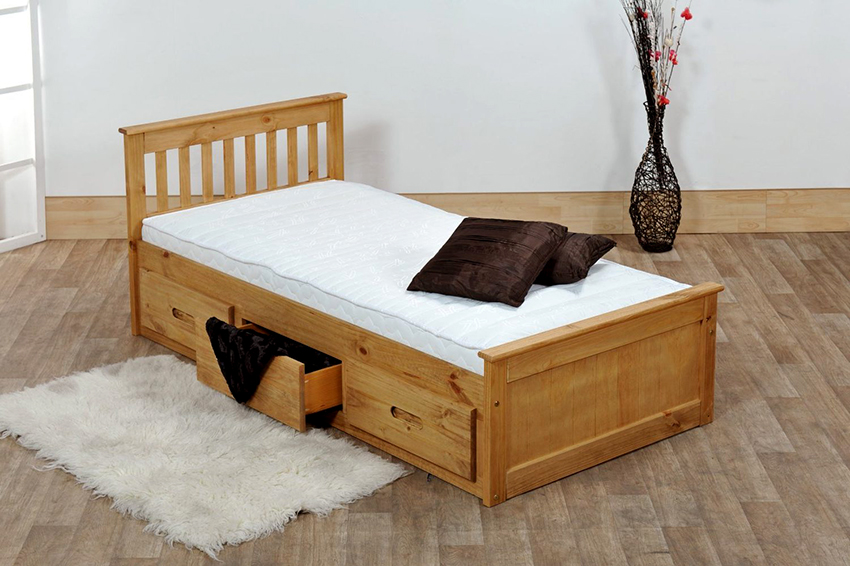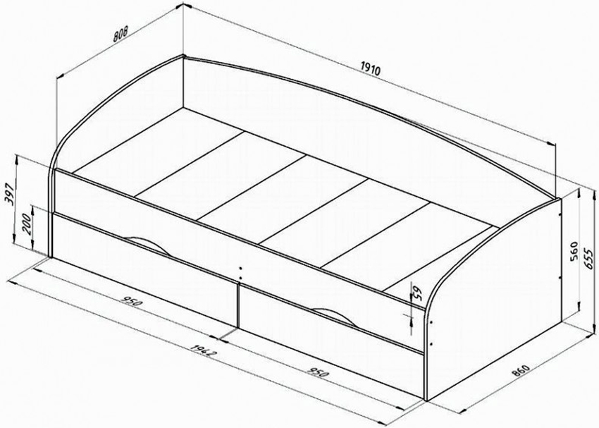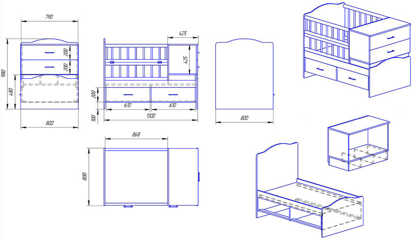 The classic single bed for children is the easiest to make. It carries a minimal functional load, since it can only be equipped with a laundry drawer. The design consists of a frame, headboard, footboard, base, sidewalls and legs, which are clearly displayed by the drawings of the baby bed. The size of the frame, for the manufacture of which a wooden beam is used, depends on the dimensions of the berth, which is determined by the parameters of the mattress.