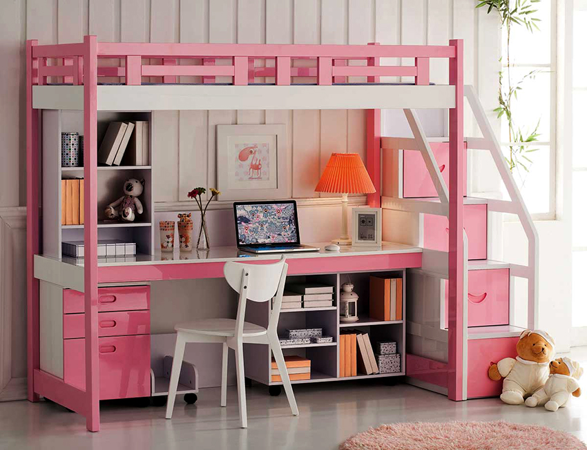 The loft bed is very popular with parents as the design can be used for children from 3 to 14 years old. This model saves space. It consists of a children's bed with sides, which is located on the second tier, and pieces of furniture in the form of a chest of drawers, shelves, drawers and a table on the first floor. Different models can be equipped with different individual elements.