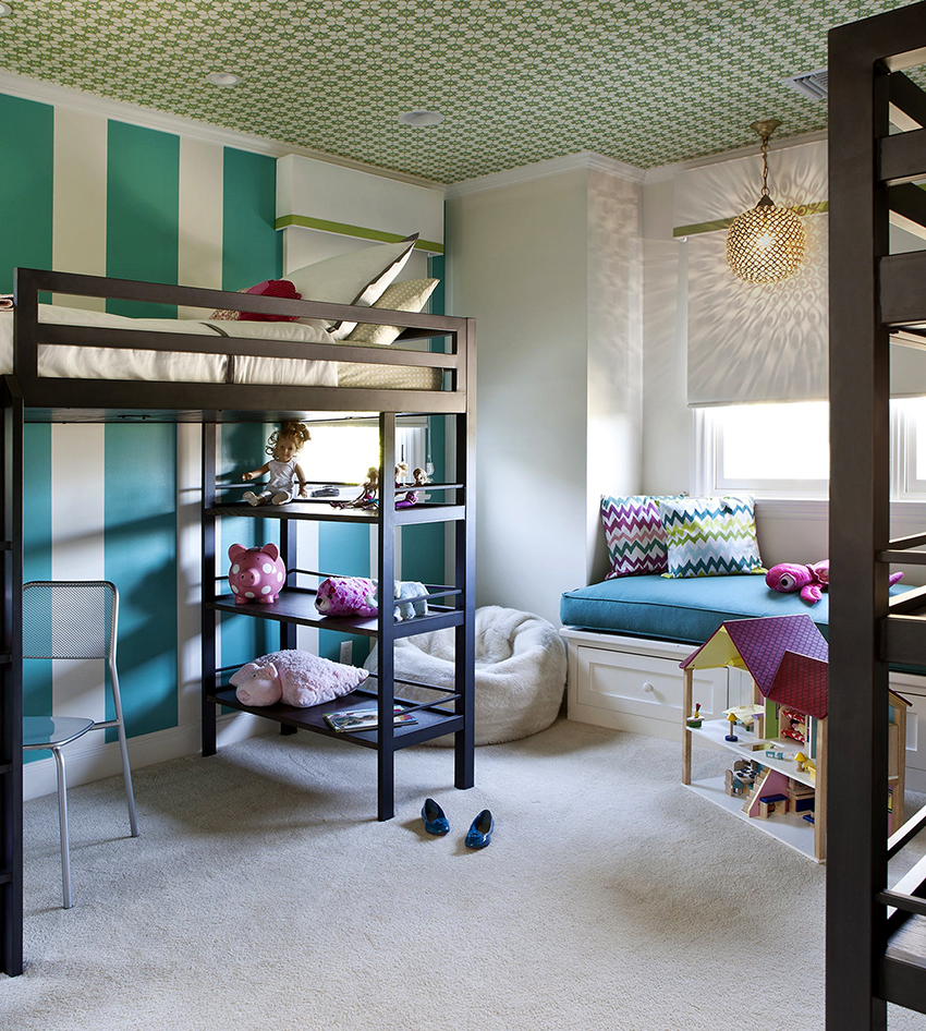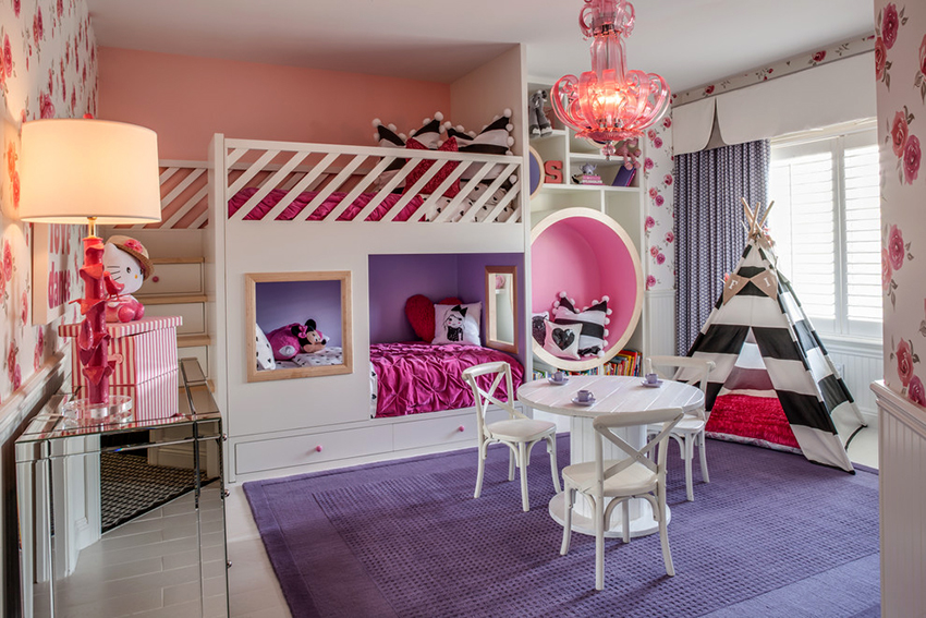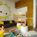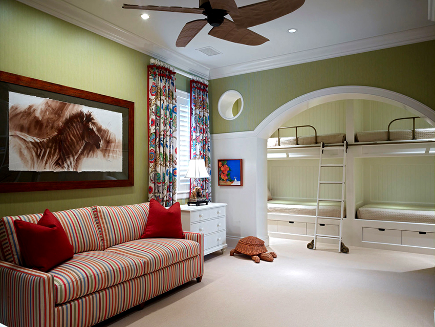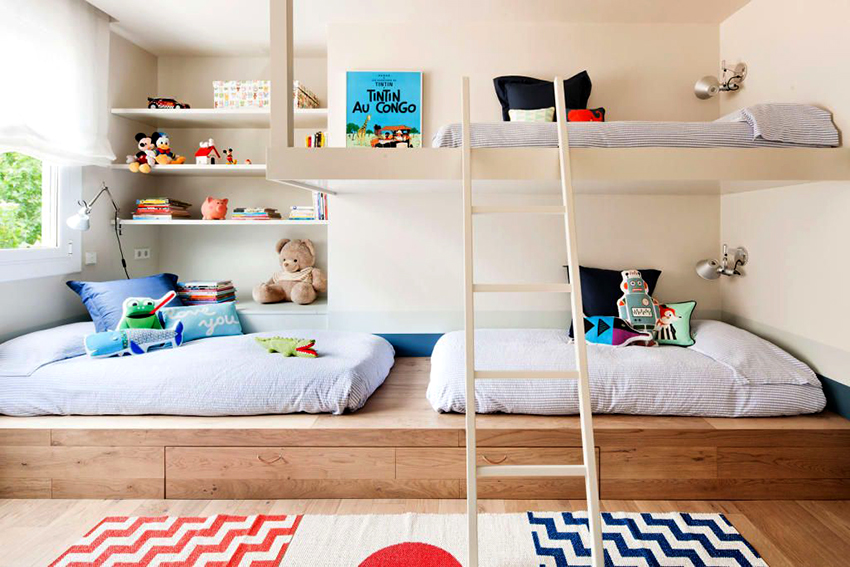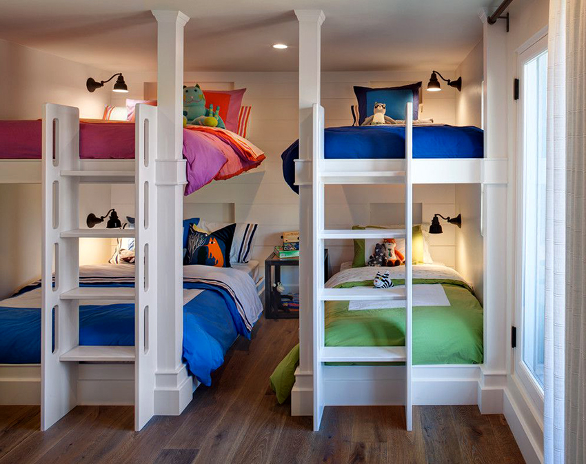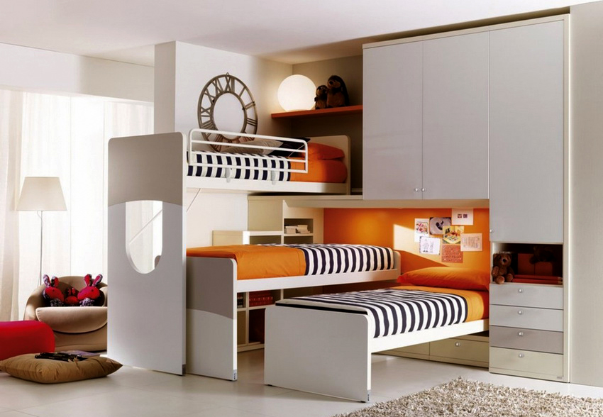 For three children, separate berths can be arranged perpendicular to each other. Such an interesting option is acceptable for rooms with high ceilings.