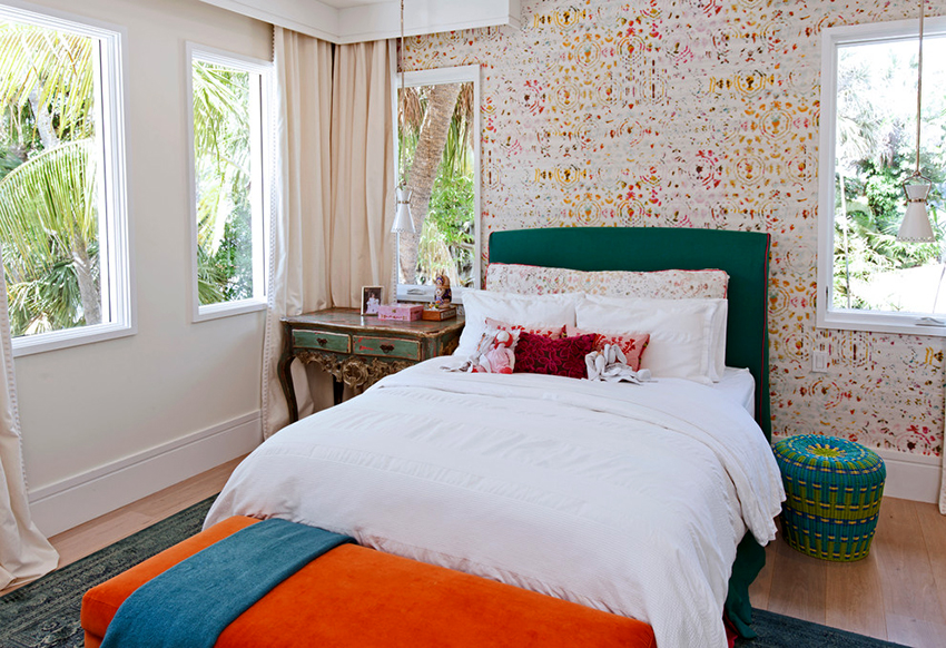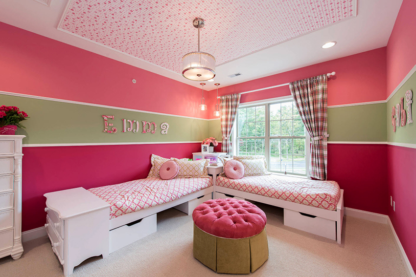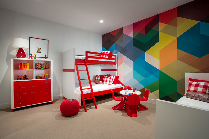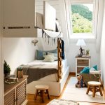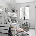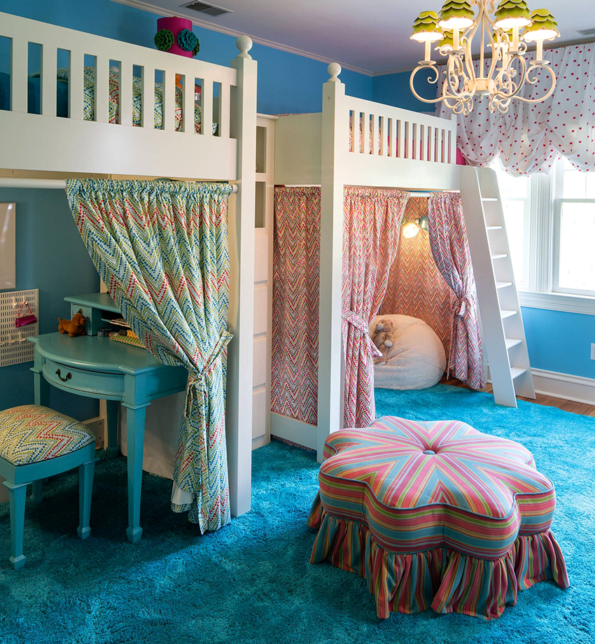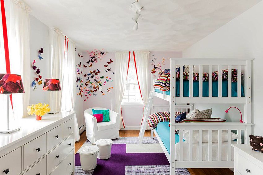 For three children, separate berths can be arranged perpendicular to each other. Such an interesting option is acceptable for rooms with high ceilings.