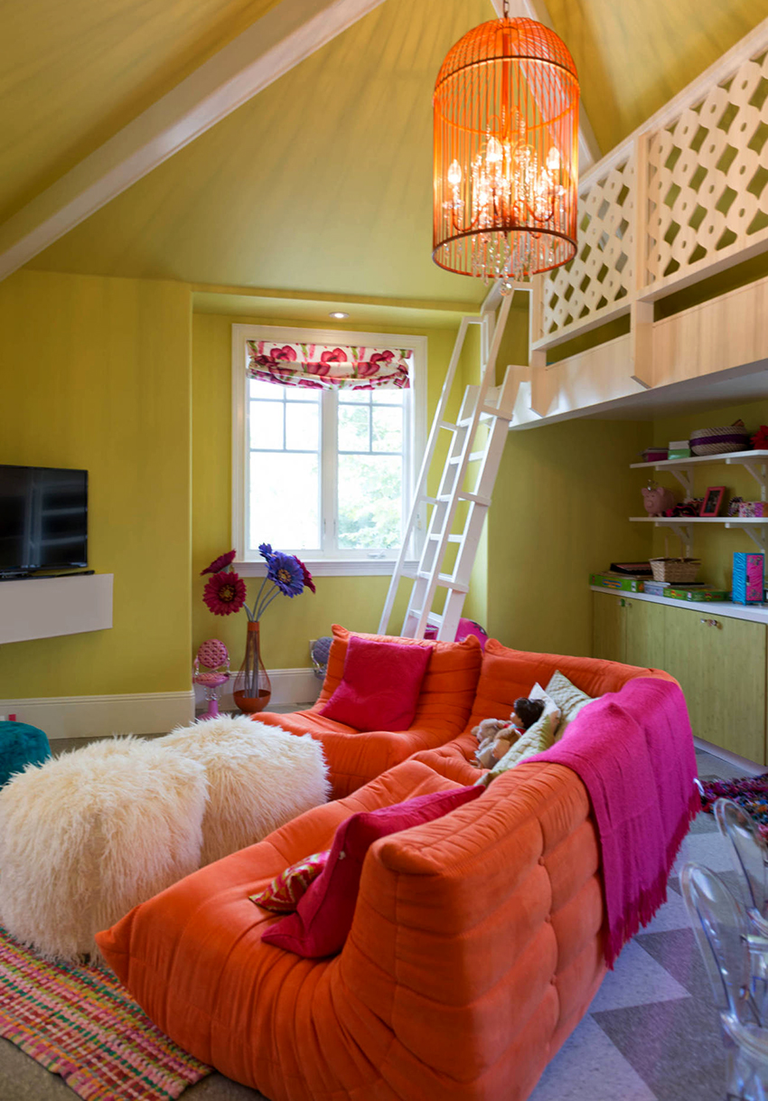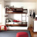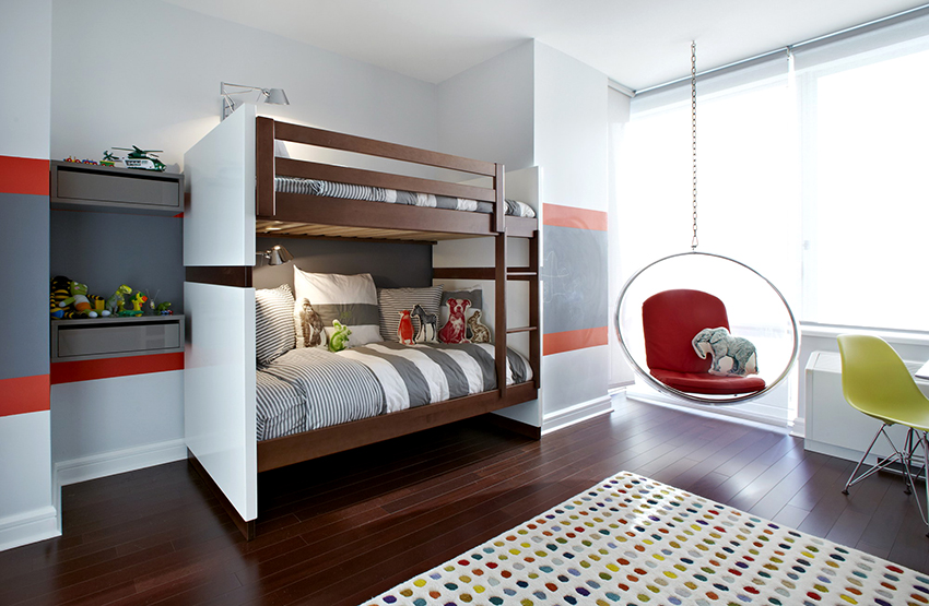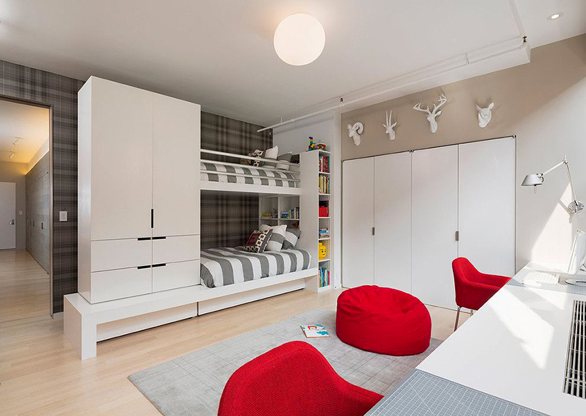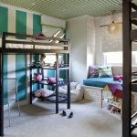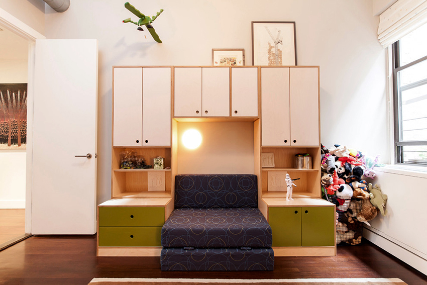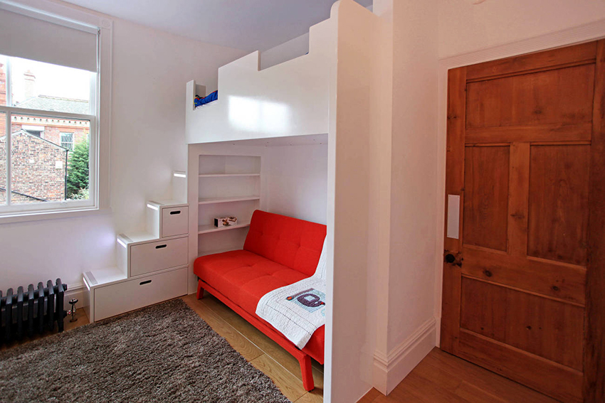 Bunk beds-sofas look unusual and functional. This design can be used for three children. Two same-sex children will sleep on the couch located on the lower tier, while the third will occupy the upper floor. It is also a good solution for families with a child who live in a one-room apartment. In this case, the parents can sleep on the couch downstairs and the child on the bed upstairs.