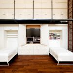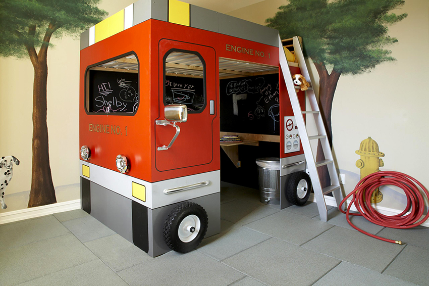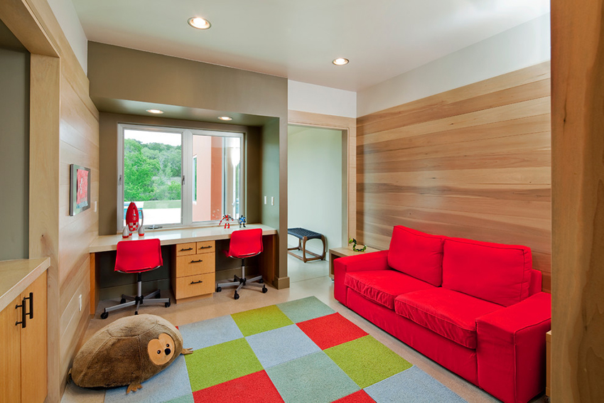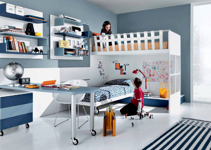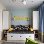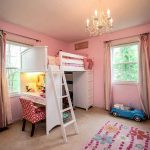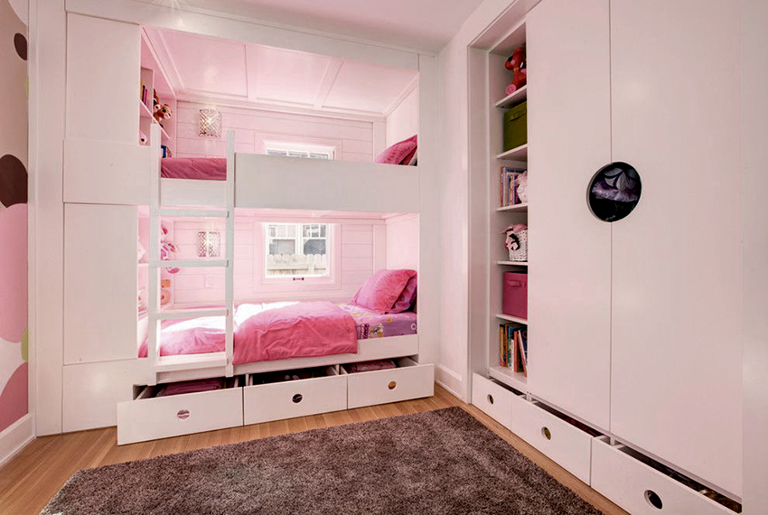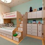 The space under the bed is organized differently. There may be separate areas for each child, taking into account his age, or the space is divided into a joint workplace, an area for games and a storage system, which is clearly shown in the photo of a children's corner with beds.