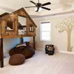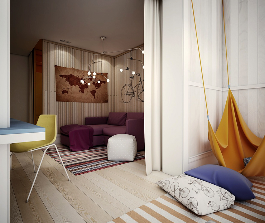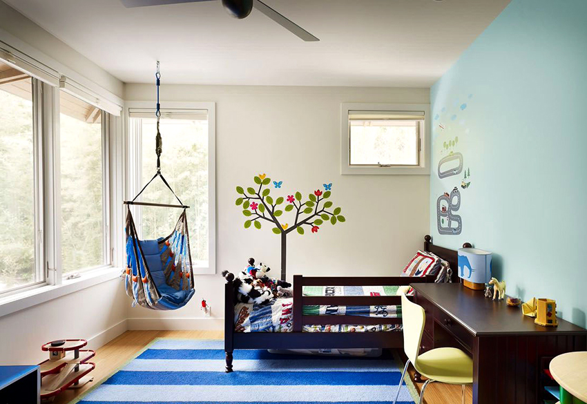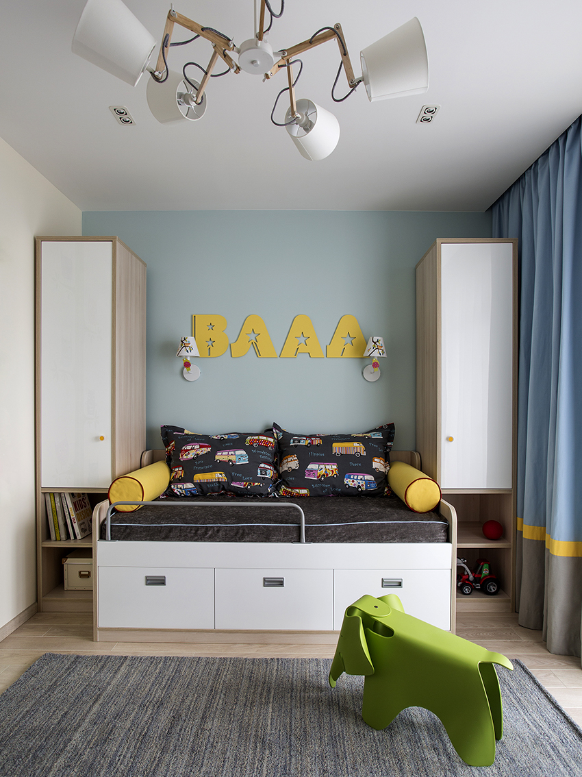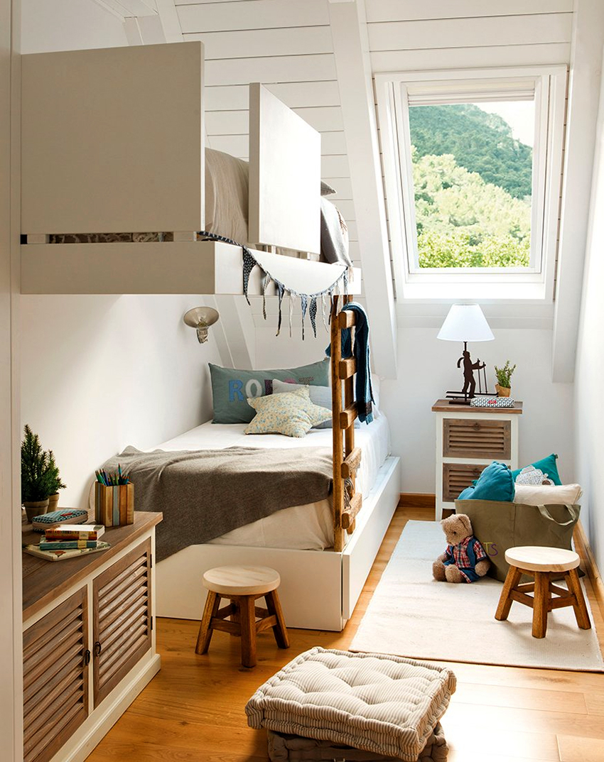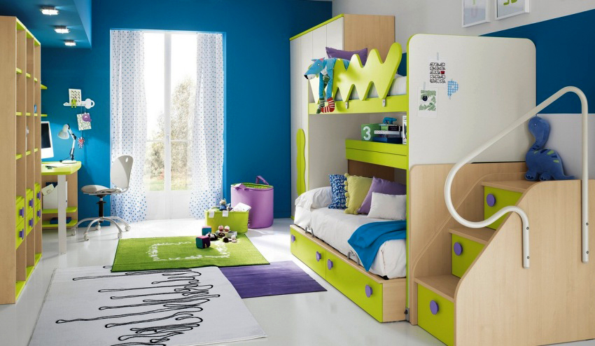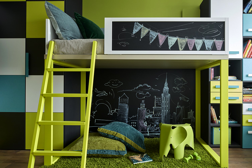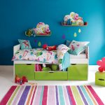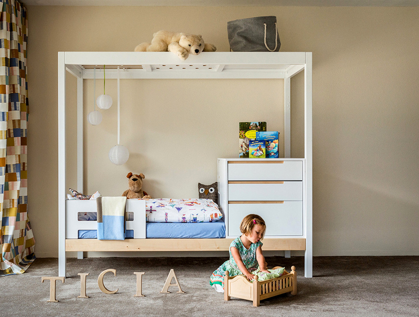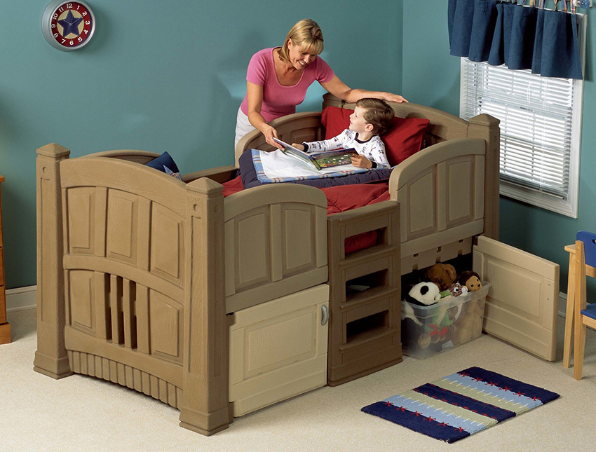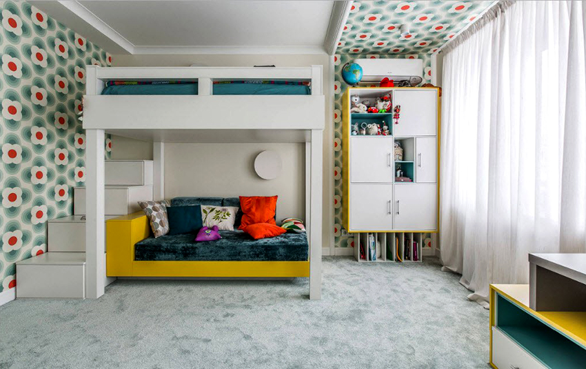 The area under the bed can remain open. It is recommended to equip a sports corner there that will promote the physical development of the baby.