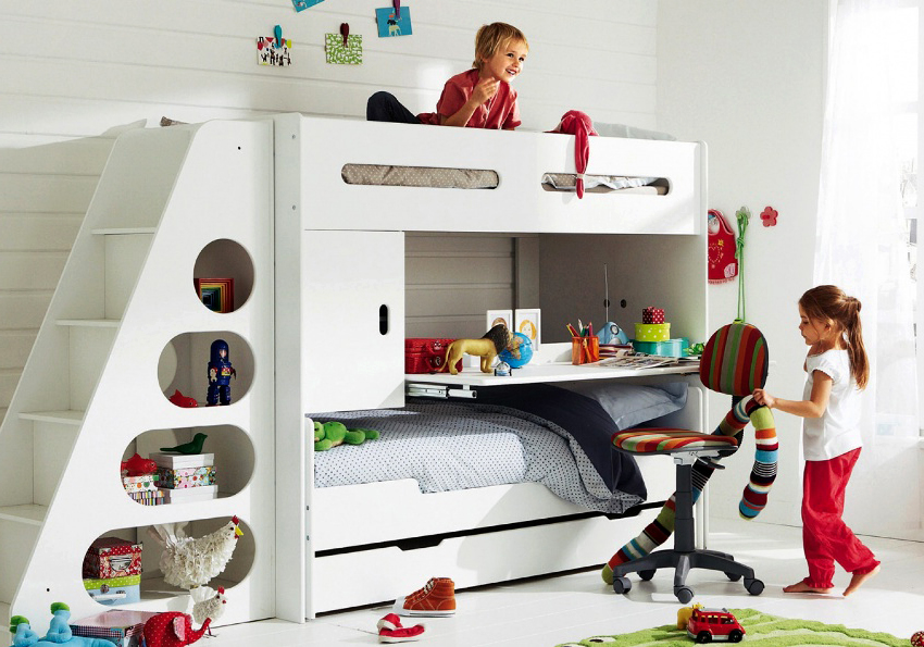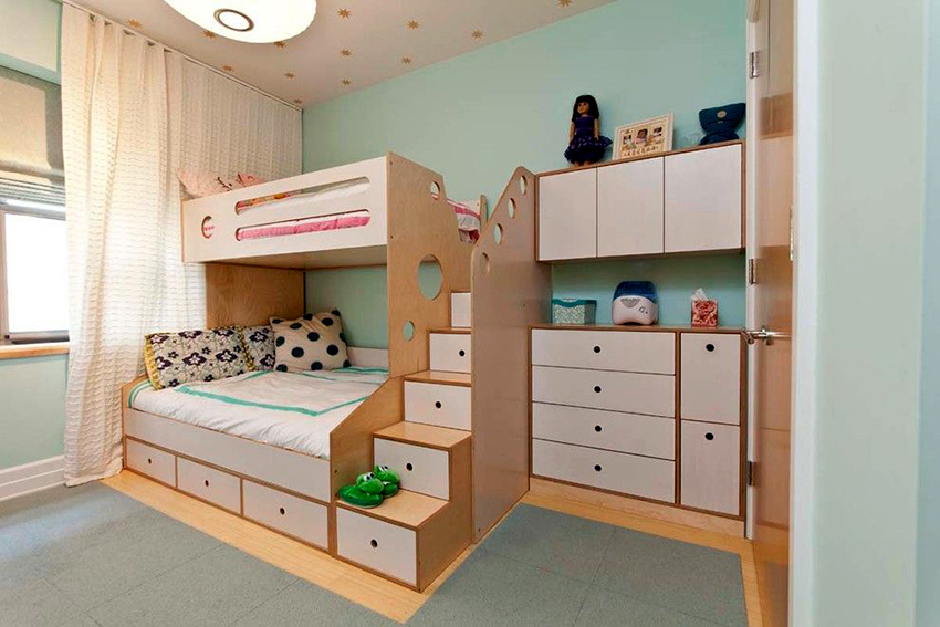 Children's bunk bed with drawers has a high functionality. This bedroom set has a number of advantages over the traditional model: