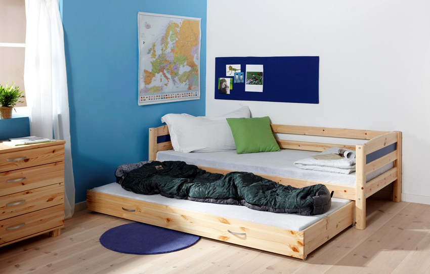 The most popular model is the pull-out bunk bed for children. It can be composed of two or three elements. When folded, the structure takes the place of a single bed. By pulling out one or two lower tiers, you can get separate berths. The elements are either combined with each other or are separate, which allows you to move a separate tier anywhere in the room.