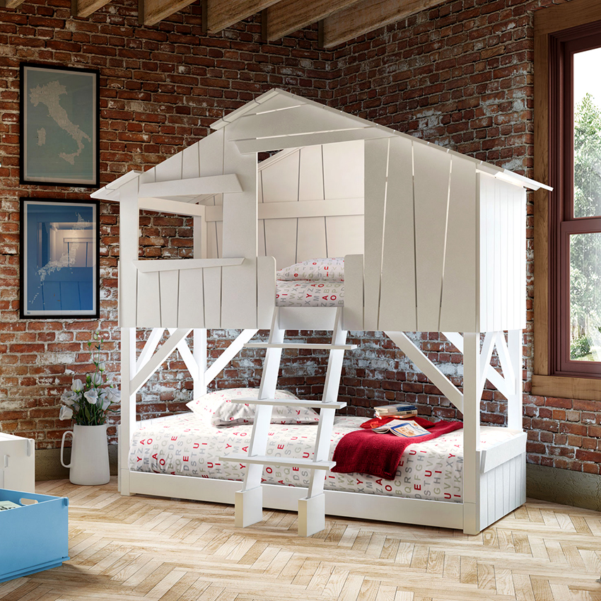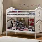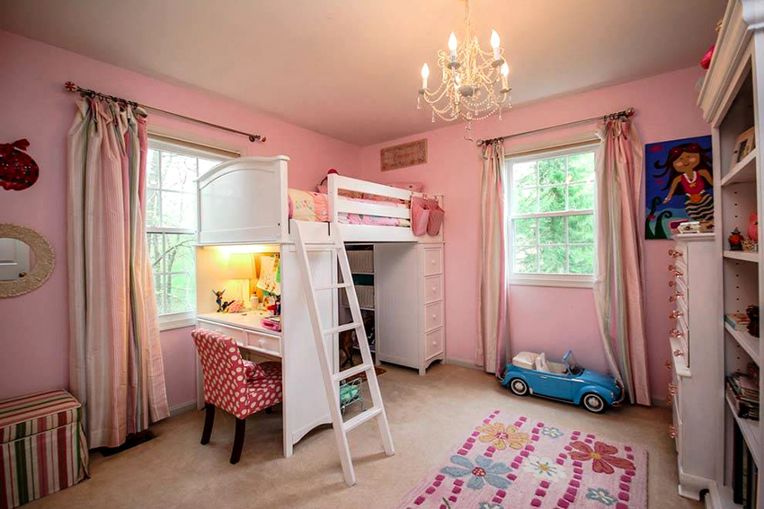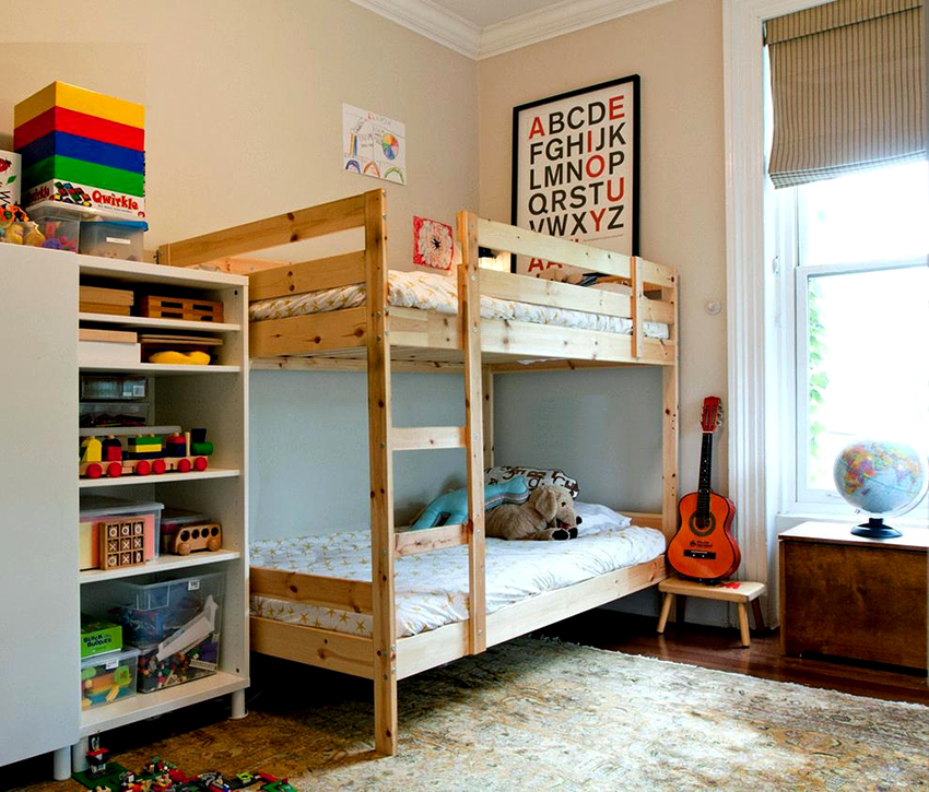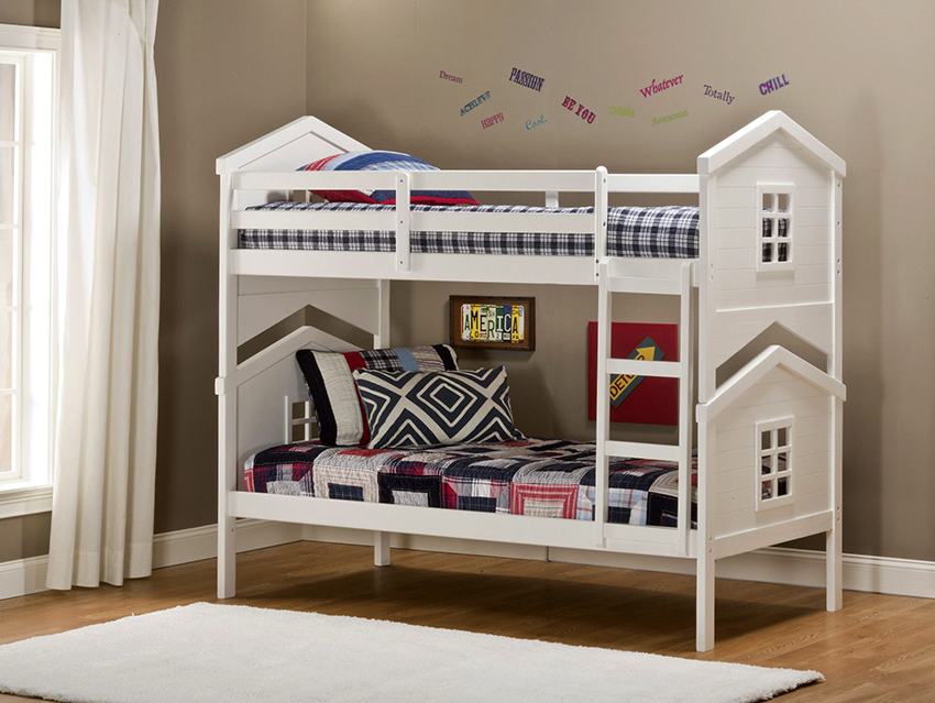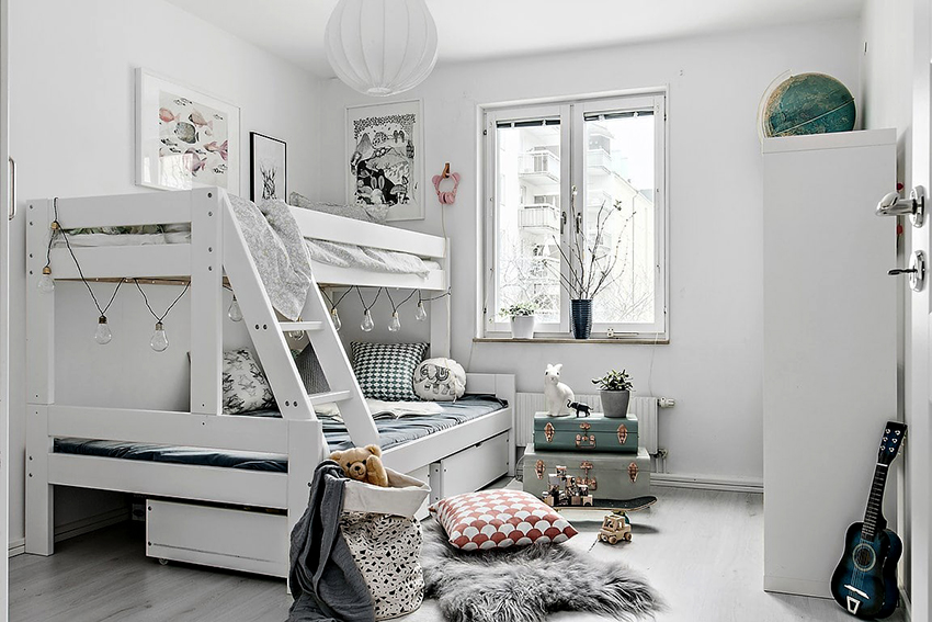 A bunk bed for two children most often has a height of 1.5-1.8 m.Bed sizes may vary. The width of the bed of the second tier is usually 80-90 cm, the length is 200 cm. The lower bed is 20 cm shorter than the upper one. This is because the older child will sleep upstairs and the youngest downstairs.