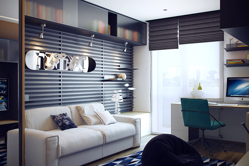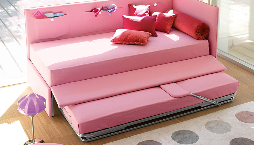 A sofa bed will appeal to a teenager. The models have a standard length of 190 cm and an unfolded width of 70-160 cm. There are different designs. The simplest is the single-bed model. It is equipped with three backs.It is enough to place a pillow at the side railing, and the sofa immediately turns into a bed.