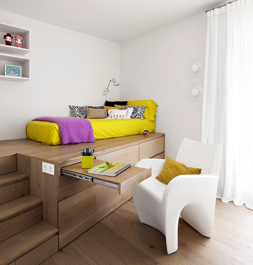 Another type of transforming bed is a design with a podium in which the product is located. Such a retractable baby bed allows you to get more free space for organizing a play or work area. The berth can also be placed on the podium, and a convenient storage system is organized at its base.