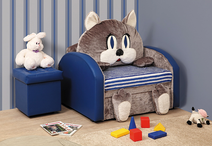 When folded, such a product occupies a small area, which allows you to free up space for games in small rooms.Chair-beds are equipped with a convenient mechanism that allows even a child to easily unfold and fold the product. Modern models are presented in a wide range of designs. There are simple options with colored furniture upholstery. The children's chair bed can be made in the form of a bear, car, butterfly, cat, steamer, ship, etc.
